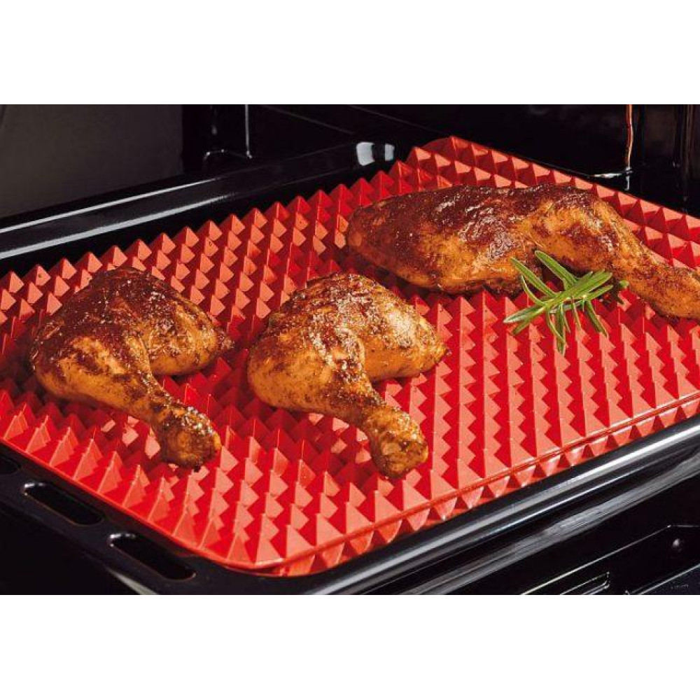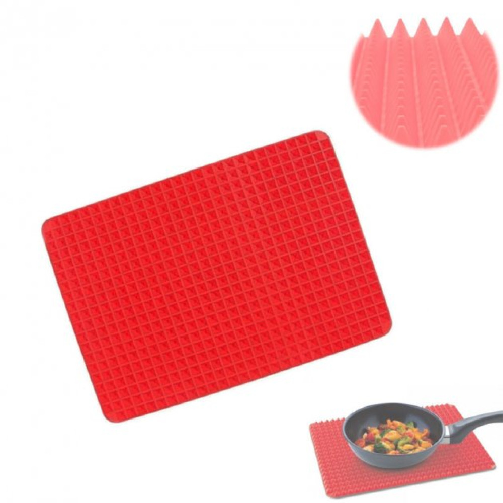 Антипригарный силиконовый коврик – противень для гриля и выпечки + Подставка под горячее Pyramid Pan Cooking Mat может служить как противнем для запекания, так и возможно использование в качестве кондитерской форме. В случае противня позволит равномерно и удобно запекать любимые блюда, а продукты готовки, лежащие на вершинах пирамидок, не контактируют непосредственно с противнем и имеют улучшенную циркуляцию горячего воздуха. Пирамидки достаточно упругие и не прогибаются под тяжестью продуктов.