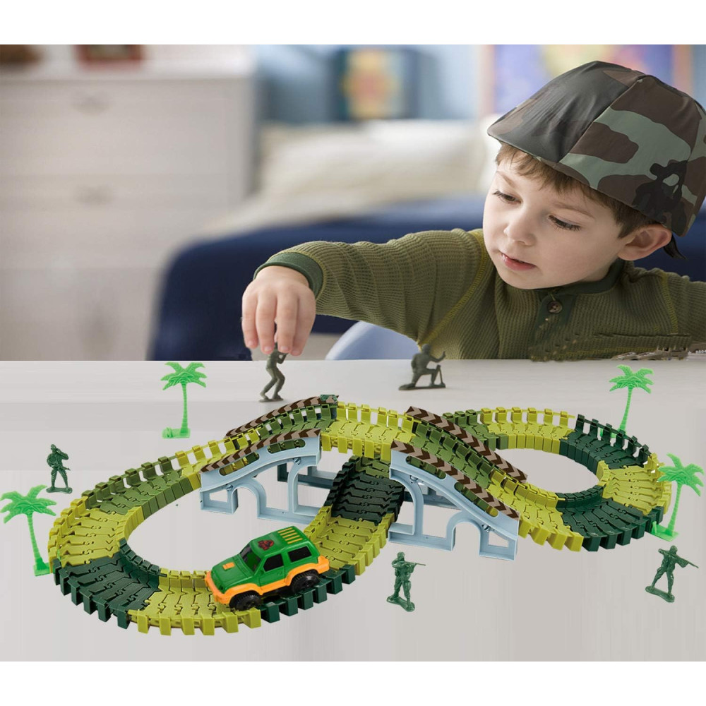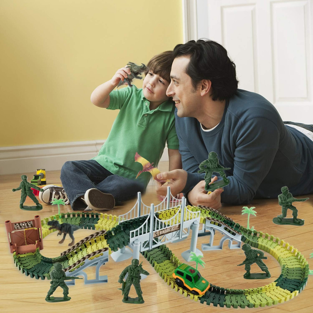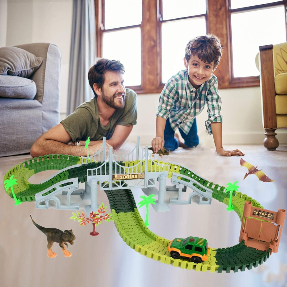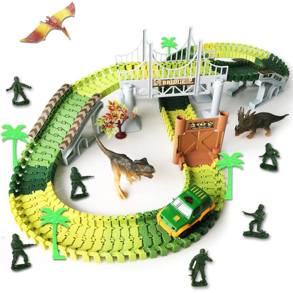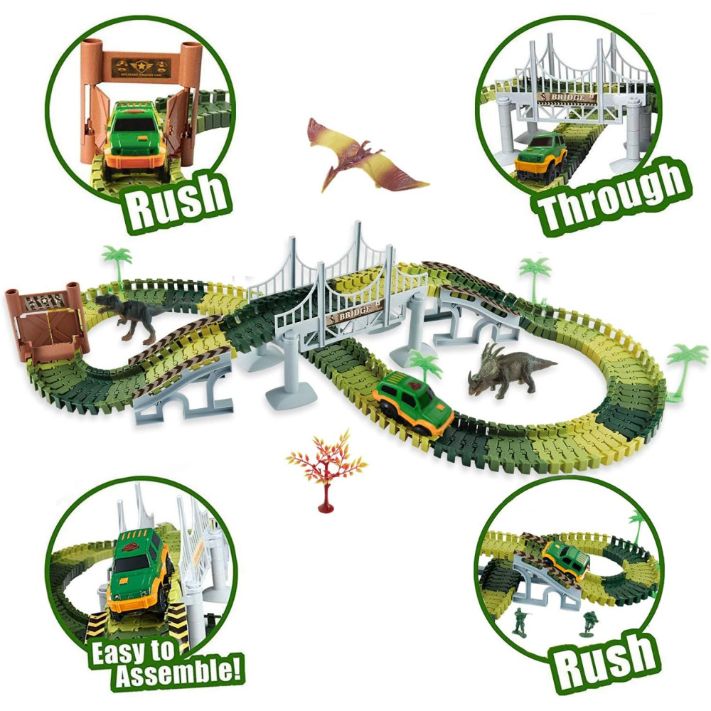 Детский трек Dinosaur Tracks на 192 детали позволяет создать увлекательный сюжет в мире динозавров. Яркие фигурки динозавров, деревьев и опорные элементы вместе с электрической машинкой превращают игру в полноценное приключение. Гибкий трек легко собирается в любую конфигурацию: подъёмы, спуски, повороты, кольца и длинные трассы. Детали прочно соединяются между собой и легко разбираются, позволяя постоянно менять трассу