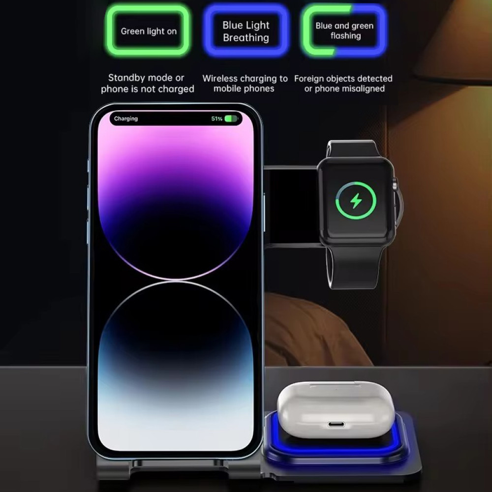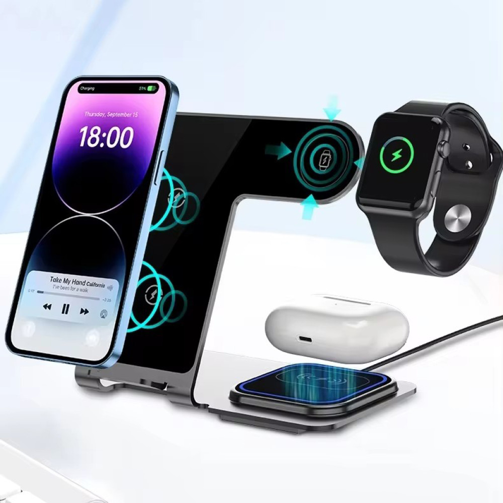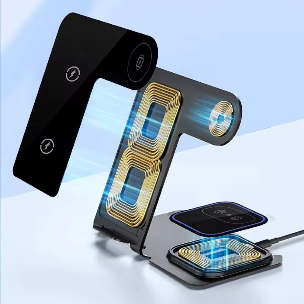 Беспроводная зарядная станция 3 в 1 · Магнитная держатель-подставка 15 Вт · Зарядное устройство для телефона, часов и наушников