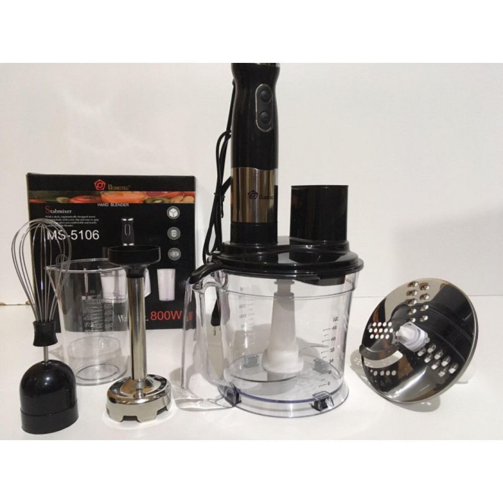 Погружной блендер Domotec MS-5106 – это компактный бытовой прибор мощностью 800 Вт, который будет прост в использовании, надёжен и безопасен. Модель можно использовать для измельчения, смешивания и взбивания продуктов.