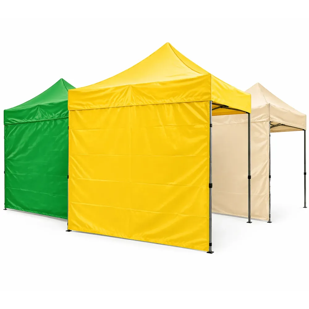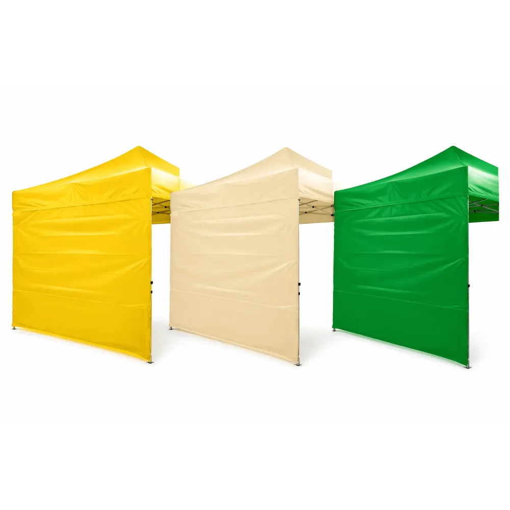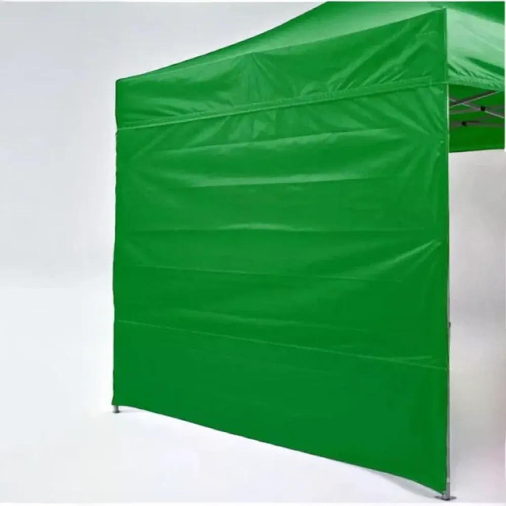 Сплошная стенка позволяет лучше организовать пространство внутри конструкции и улучшить условия использования шатра на открытом воздухе. Она частично закрывает боковую сторону, делает конструкцию более аккуратной и завершенной. Доступные цвета: зеленый, бежевый, желтый.