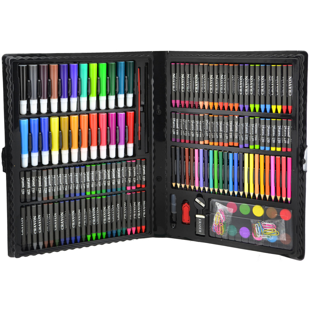 В нашем наборе есть все необходимое для занятие любимым дело, а именно 228 предметов: цветные карандаши, акварельные краски, восковые мелки, маркеры, канцелярские принадлежности и много другое!
