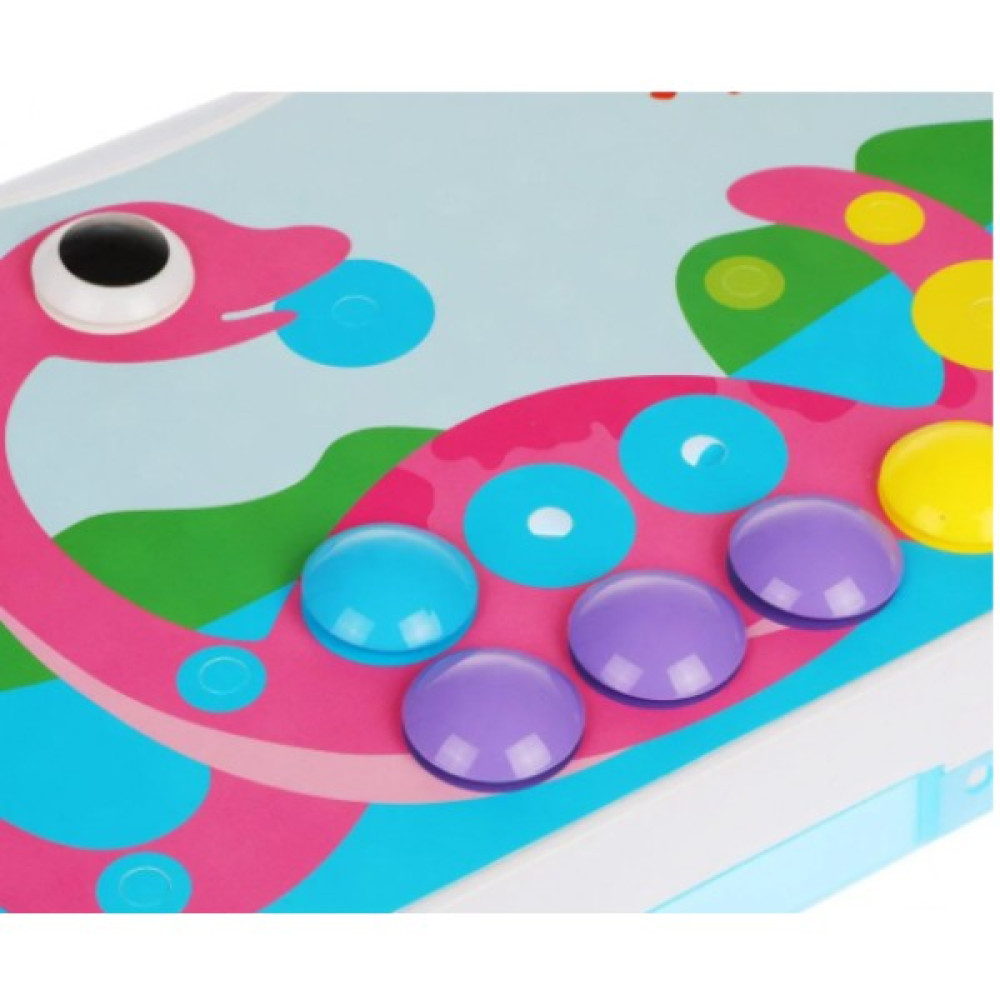 В состав набора входят 224 элемента (в том числе электрифицированная дрель), 1 иллюстрированная книжка с примерами работ и 8 красочных карточек с изображениями динозавров. Одна из сторон чемоданчика представляет собой игровое поле с отверстиями, на котором можно выкладывать мозаику и возводить необычные конструкции при помощи дрели.