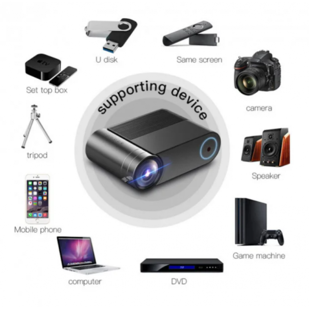 Помимо основных способов передачи видео контента на проектор с игровой или видео приставки, флешки и прочих, у данного проектора поддерживается передача данных через беспроводной канал связи WiFi. Это позволяет подключаться к проектору с мобильного телефона или ПК без проводов, что очень удобно и практично.