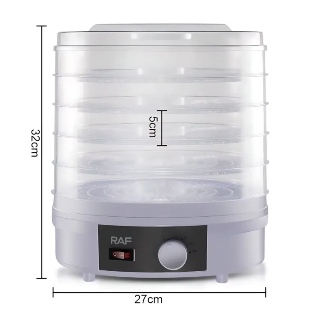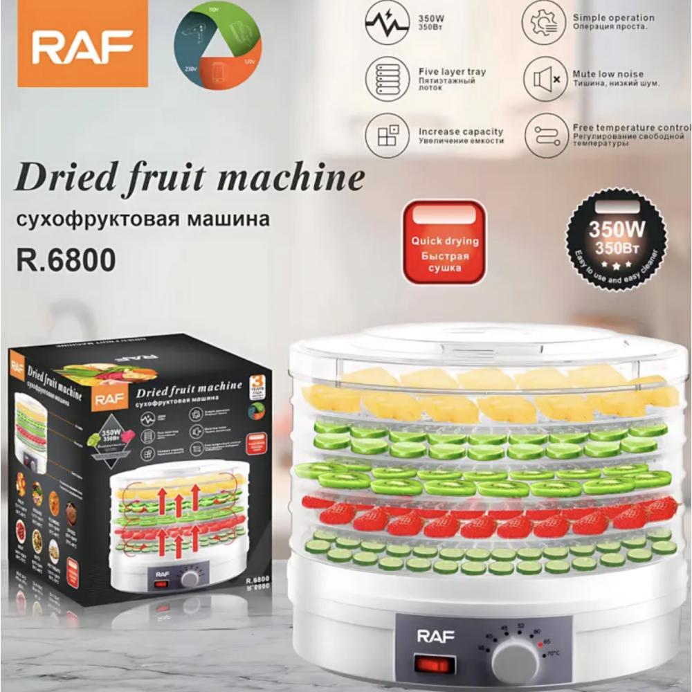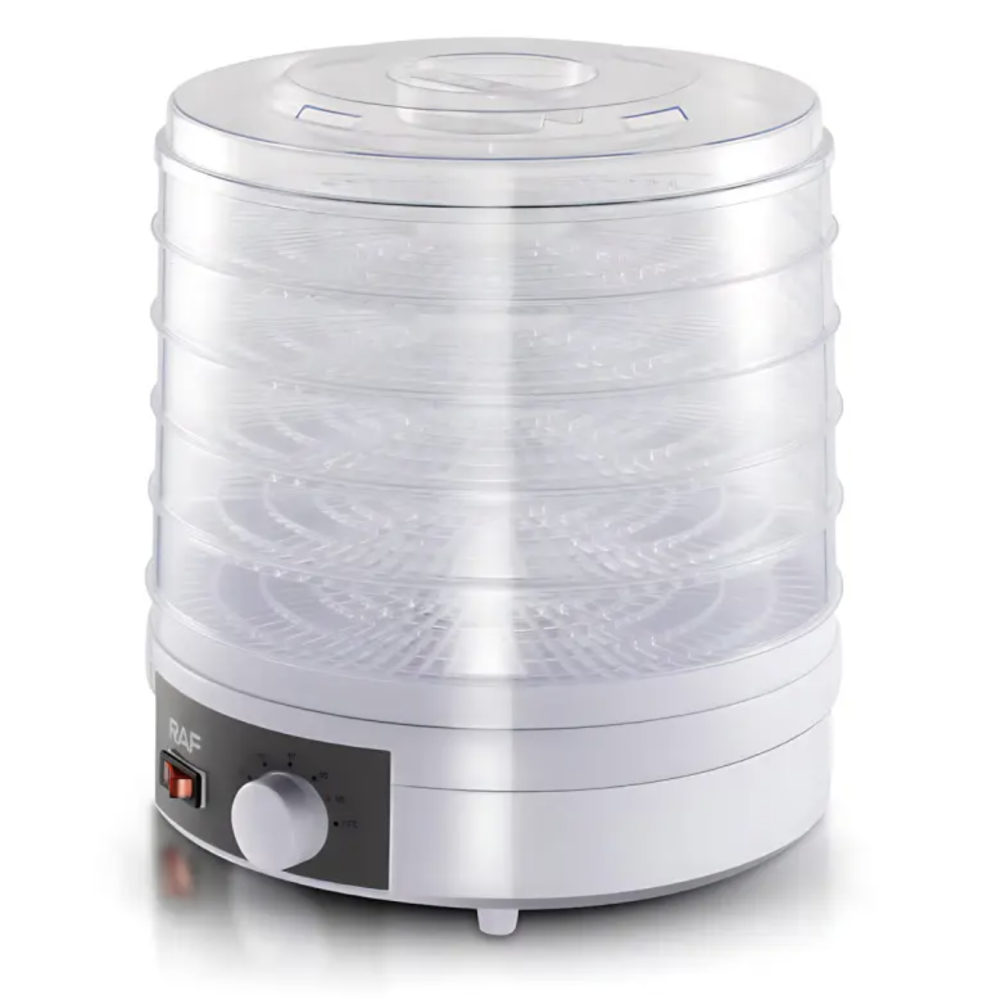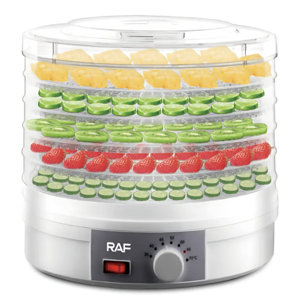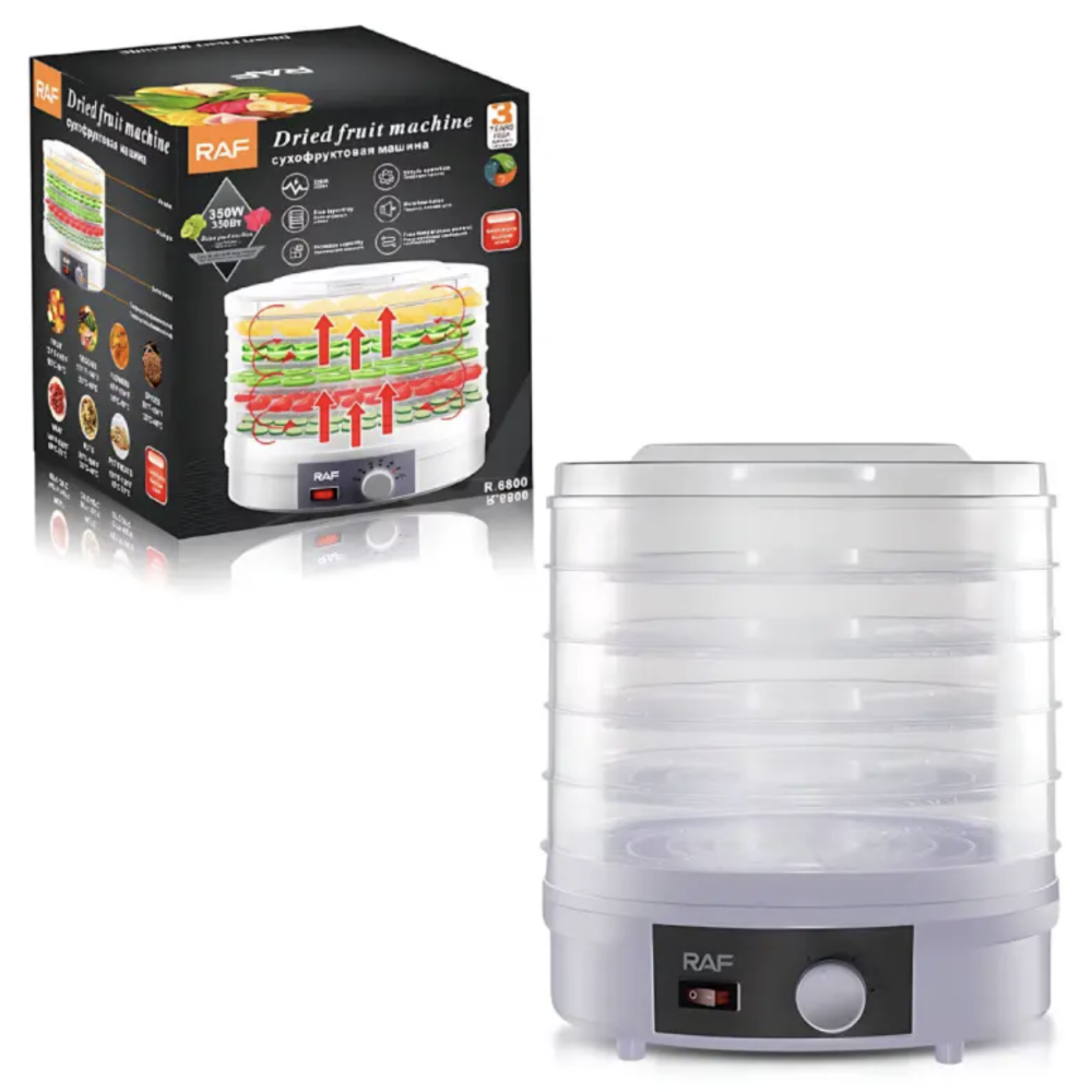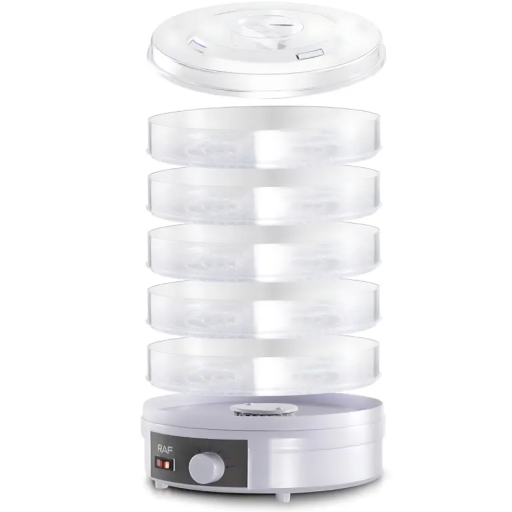 Электрическая сушилка RAF R.6800 — незаменимый помощник для любителей здорового питания и натуральных закусок. Благодаря 5-ярусной конструкции вы сможете одновременно сушить большое количество продуктов, сохраняя их витамины, натуральный вкус и аромат. Устройство отлично подходит для сушки фруктов, овощей, зелени, грибов, ягод и мясных закусок, делая его универсальным решением для кухни