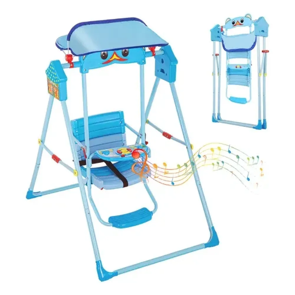 Детские складные качели для дома голубые X623 с козырьком • Напольная качеля для малыша со световыми и звуковыми эффектами, ремнями безопасности и подставкой для ног