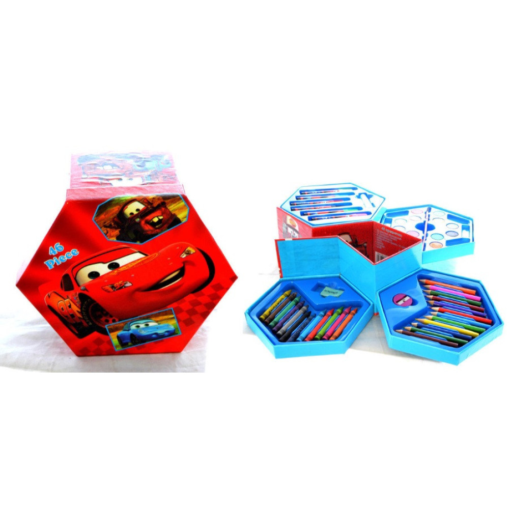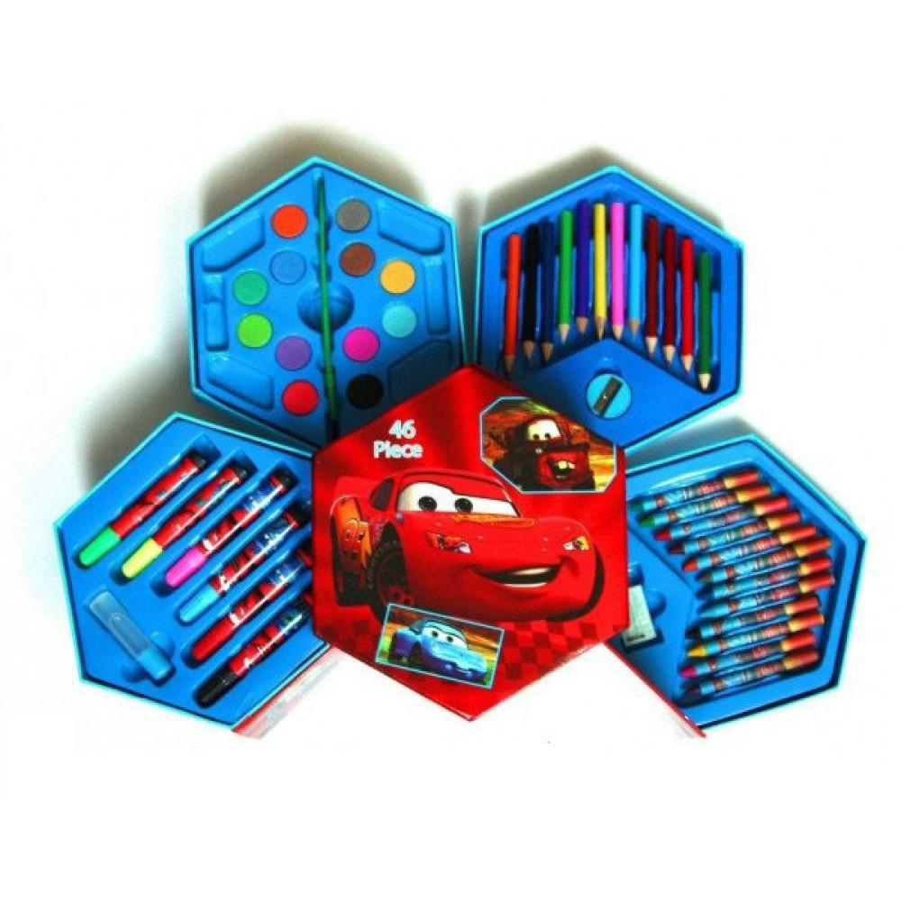 Детский художественный набор для рисования и творчества "Тачки", 46 предметов в боксе-шестиграннике очень удобно раскрывается на секции, в которых помещается 46 предметов, и компактно складывается в компактную коробочку-шестигранник.