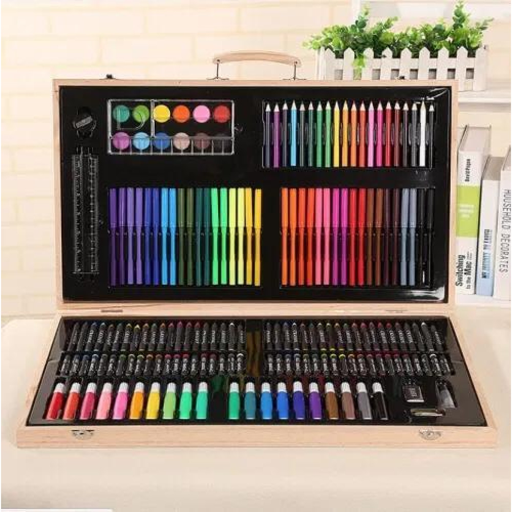 Наш Детский набор для рисования и творчества 180 предметов в деревянном чемоданчике-кейсе содержит цветные карандаши, фломастеры, акварельные краски, мелки и многое другое. Все что необходимо юному художнику в одном наборе. Отличный подарок для мальчиков и девочек имеющих склонность к изобразительному искусству. Эргономичное и компактное расположение принадлежностей, удобно в пользовании, при переноске и при хранении. Упаковка и материалы абсолютно безопасны, соответствуют санитарно-техническим нормам и стандартам качества SGS.