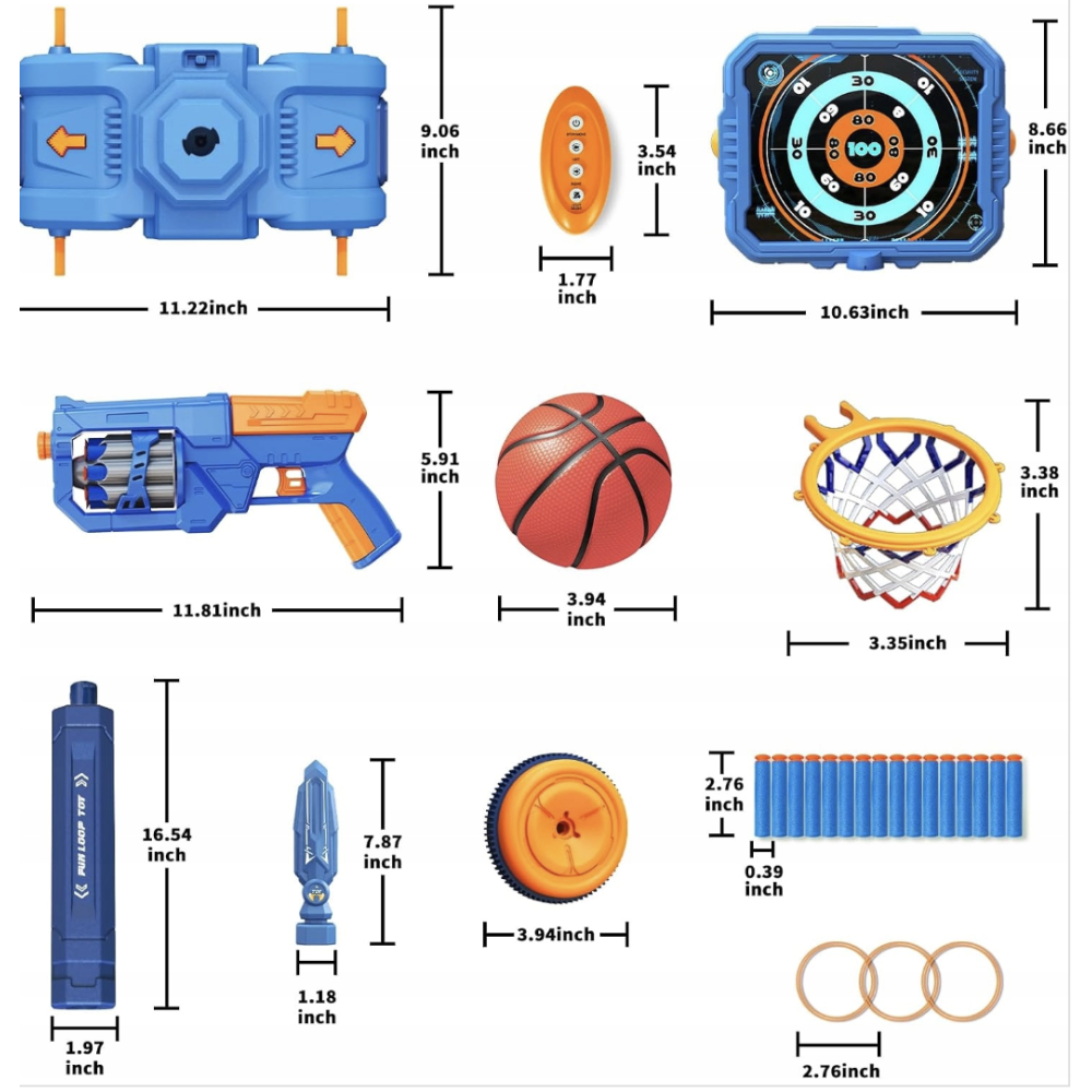 • Формат: 3 в 1 (пистолет со щитом, кольца, баскетбольное кольцо)