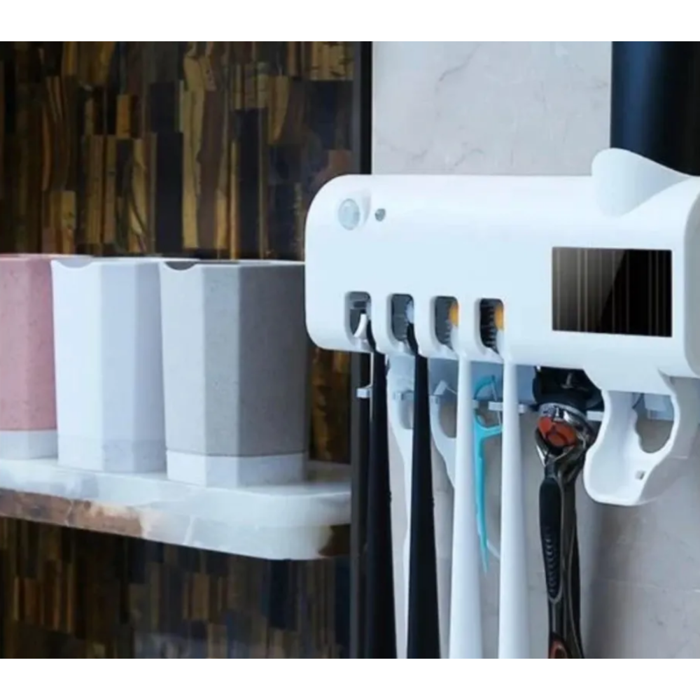 Назначение: Устройство 3в1: держатель для зубных щеток + ультрафиолетовая дезинфекция + механический дозатор зубной пасты