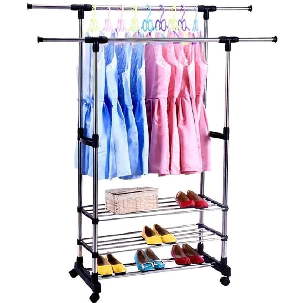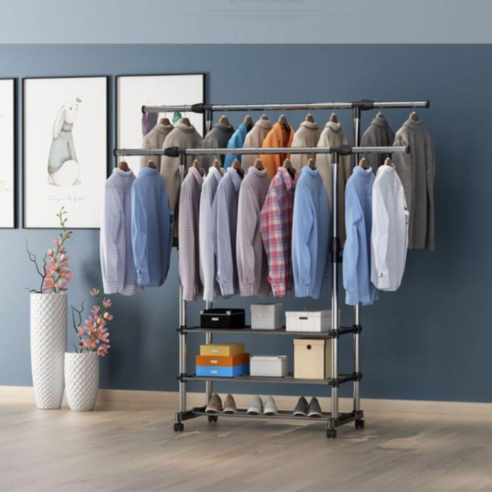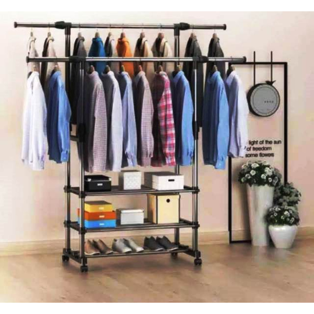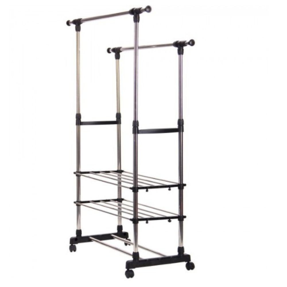 Двойная стойка – вешалка телескопическая на колесиках с полками для одежды и обуви Triple Stand Hanger - это удобный и выгодный способ размещения если не всех то необходимых вещей. Вешалка-стойка двойная телескопическая для одежды Triple Stand Hanger полностью сборная, и ее можно удлинить и сделать выше, либо же сделать уже или ниже.