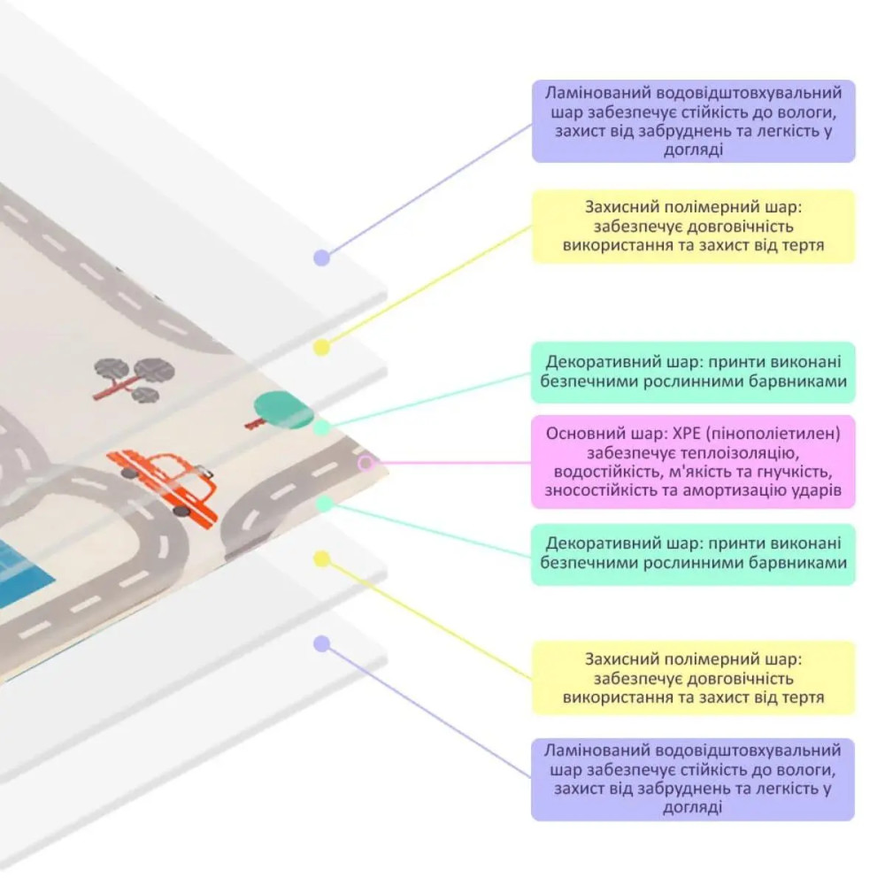 • Подходит детям с самого рождения. Мягко лежать, не больно ползать. Смягчает падение, не скользит и делает игры более безопасными. Защищает от холода и удерживает тепло. Рифленая поверхность предотвращает вероятности скольжения. Поглощает шум, активные игры не будут мешать родителям и соседям