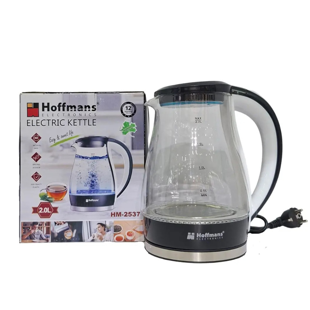 Hoffmans HM-2537 — стеклянный электрочайник с дисковым нагревом, созданный для быстрого и безопасного кипячения воды. Объём 2 литра позволяет одновременно приготовить несколько порций чая или кофе.