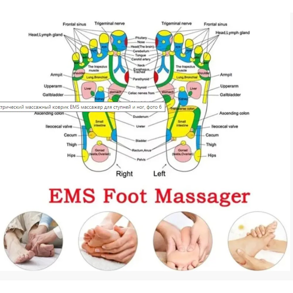 Массажный коврик EMS для ступней и ног - этот коврик обеспечит расслабляющий и лечебный эффект ступней ног. Массажер поможет восстановить кровообращение, снимет воспаление и болезненные ощущения. Коврик не рекомендуется использовать людям с сердечно сосудистыми заболеваниями, во время беременности и детям. Также он не предназначен для использования для массажа других частей тела: спина, шея, бедра.