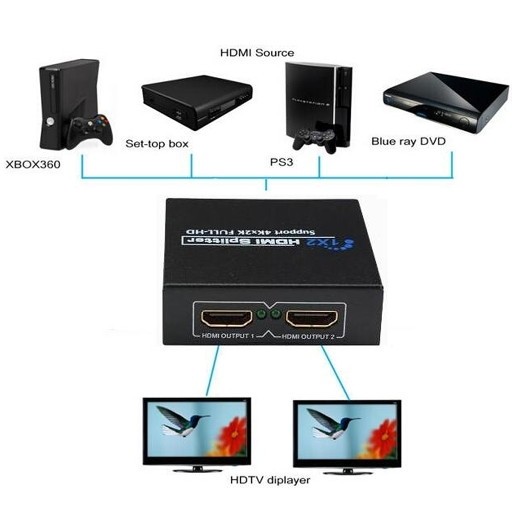 HDMI Сплиттер – разветвитель видеосигнала телевизионный коммутатор HDMI сигнала 4K 1x2 порта 3D Splitter 1080p используется для одновременного распределения изображения на 2 монитора.