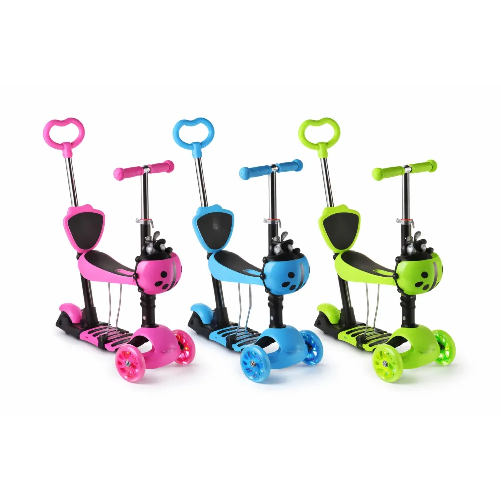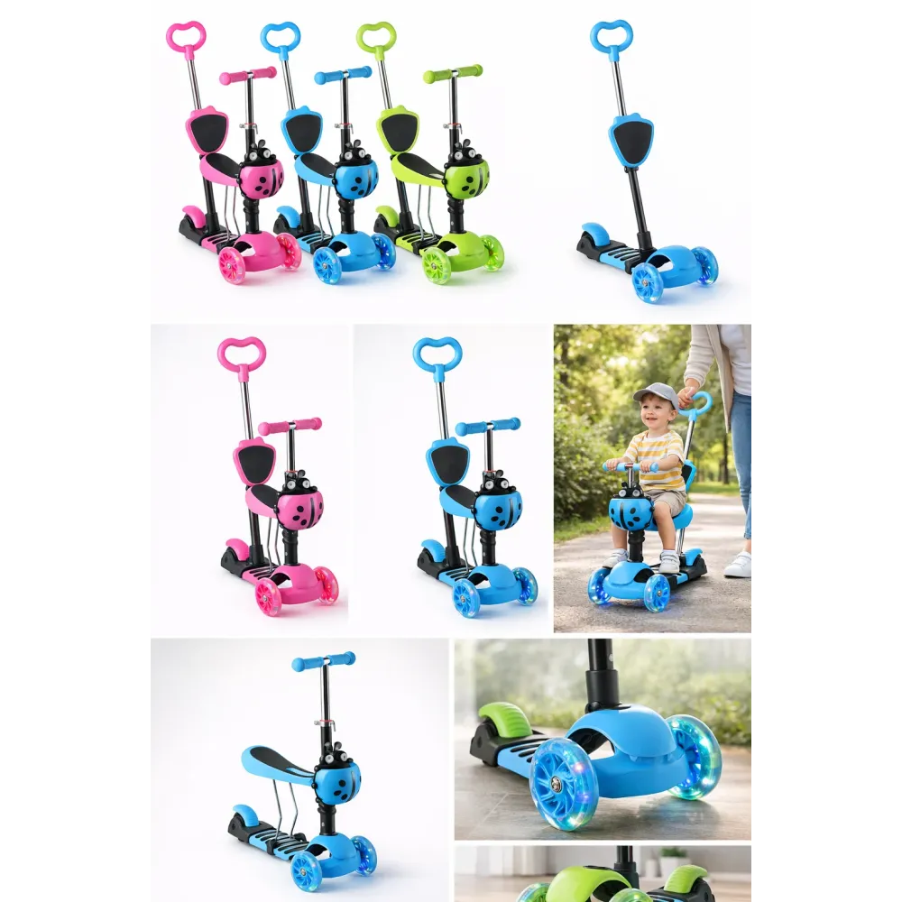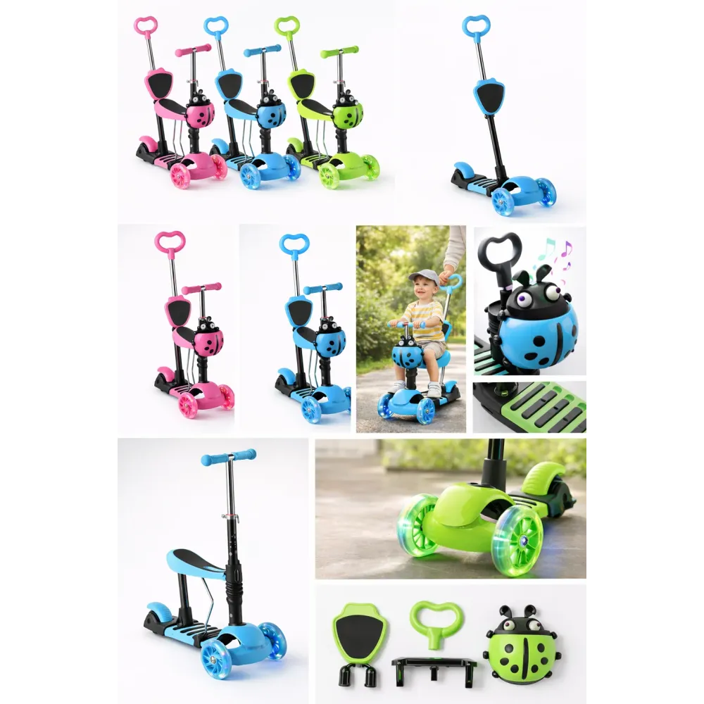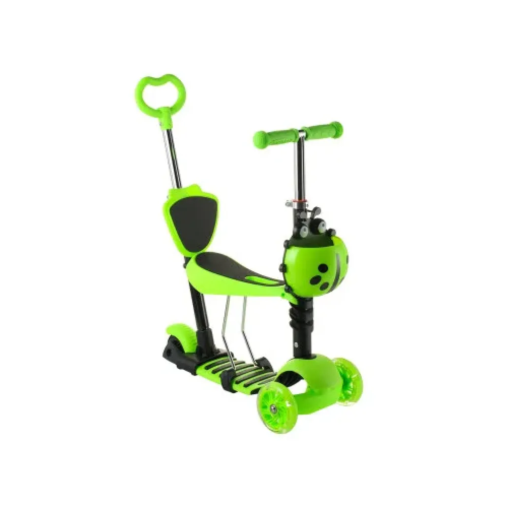 Трехколесный детский самокат 5 в 1 с родительской ручкой и сиденьем Scooter ∙ Самокат трансформер для детей со светящимися колесами, регулируемой высотой руля и корзинкой