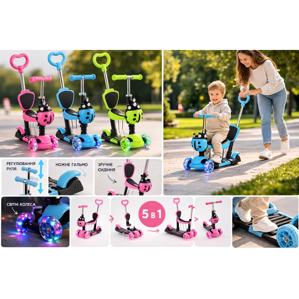 Заказывайте Трехколесный детский самокат 5 в 1 с родительской ручкой Scooter ∙ Самокат трансформер со светящимися колесами и сиденьем прямо сейчас на нашем сайте!