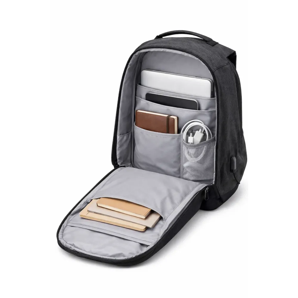 Внутреннее пространство рюкзака переработано так, чтобы пользователь мог лучше организовать содержимое под собственные задачи. Внутри предусмотрен органайзер с амортизирующими отсеками, благодаря чему можно аккуратно разместить ноутбук, зарядные устройства, документы, кошелек, очки и другие аксессуары. Основное отделение может открываться под углами 30°, 90° и 180°, что делает этот рюкзак удобным как для быстрого доступа к вещам, так и для полноценной укладки в поездке.