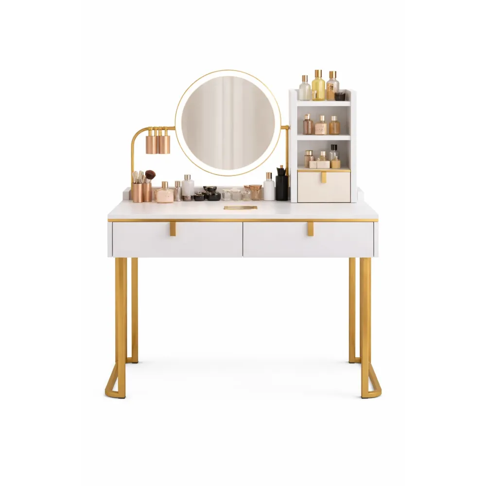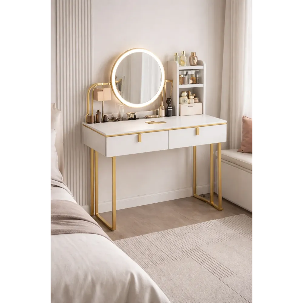 Стол макияжный STL-MD 105 белый с круглым LED зеркалом • Туалетный столик для макияжа с подсветкой, зеркалом и системой хранения для спальни и дома
