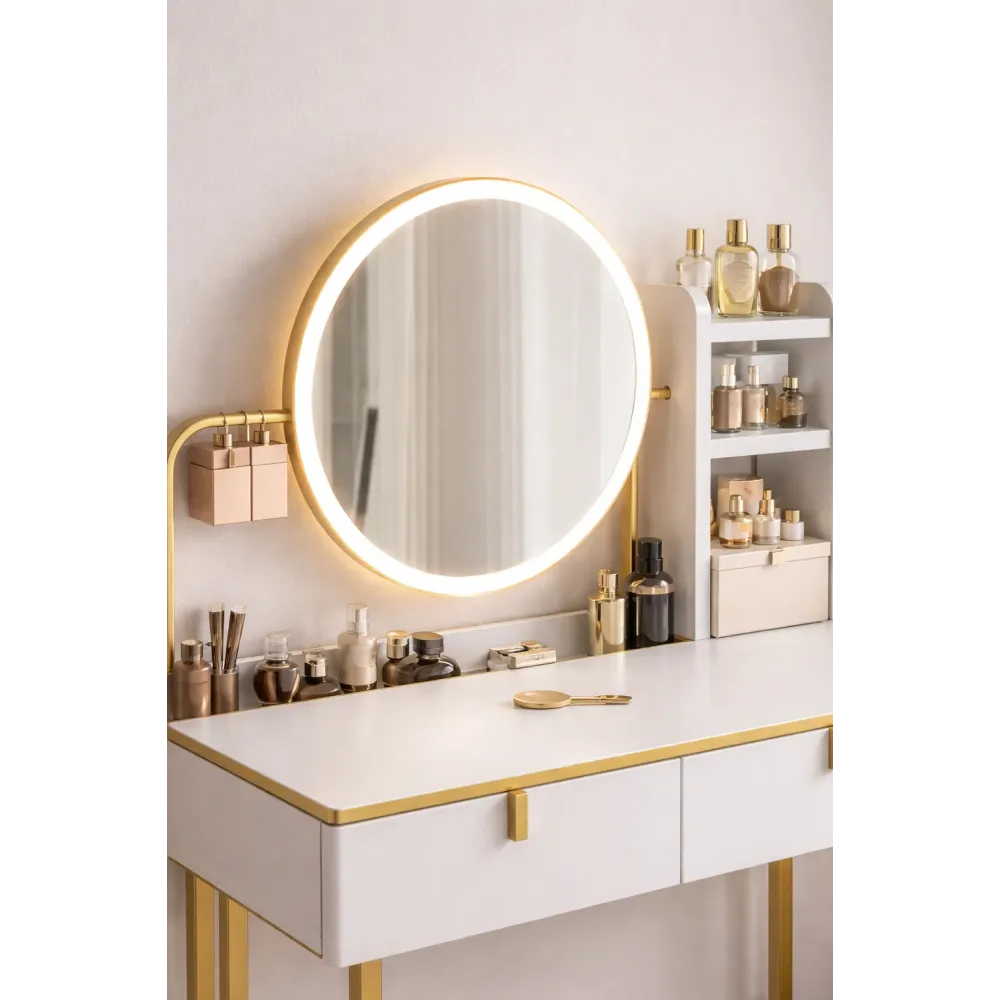 Круглое LED зеркало делает повседневные процедуры более удобными, а сама конструкция стола помогает держать под рукой все необходимое для макияжа, укладки и ухода за собой. Благодаря светлому оттенку модель визуально освежает помещение, делает его более уютным и помогает создать отдельную функциональную зону даже в комнате с ограниченным пространством. Такой туалетный столик станет удачным выбором как для личного использования, так и в качестве полезного подарка.
