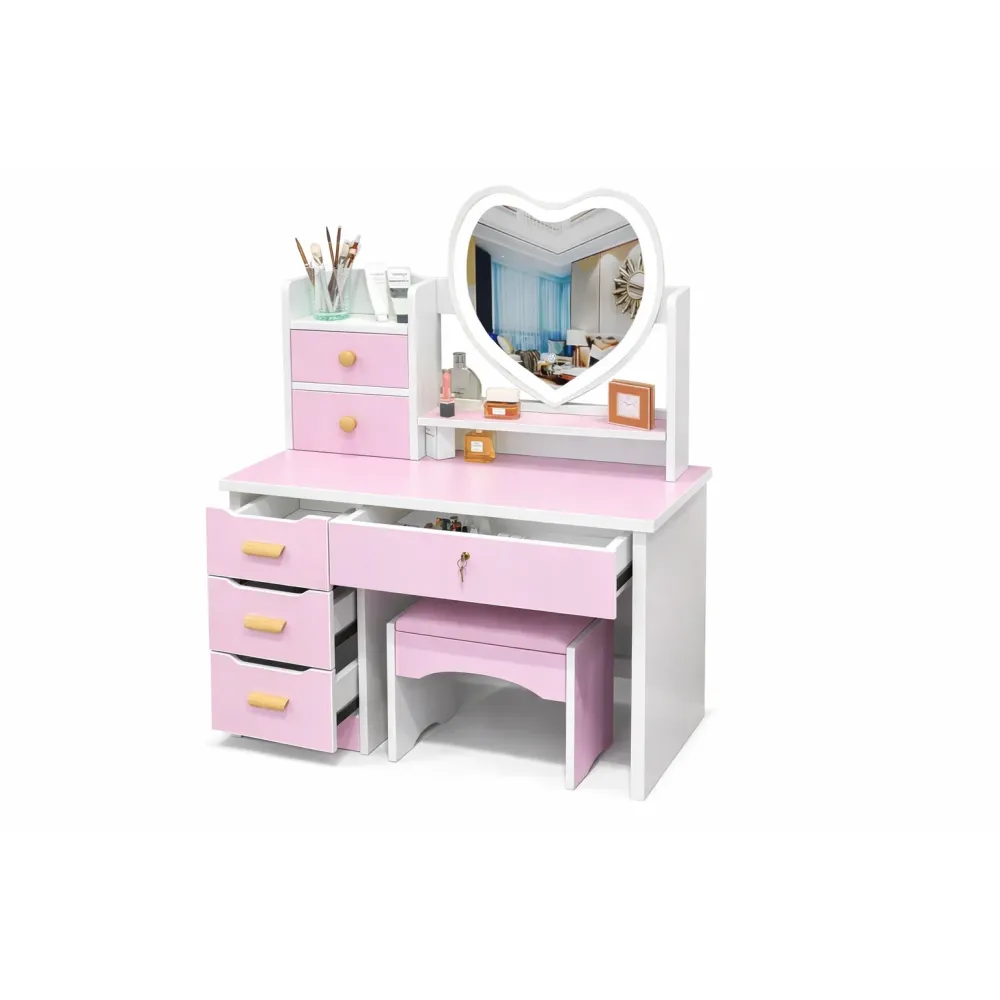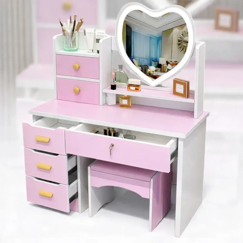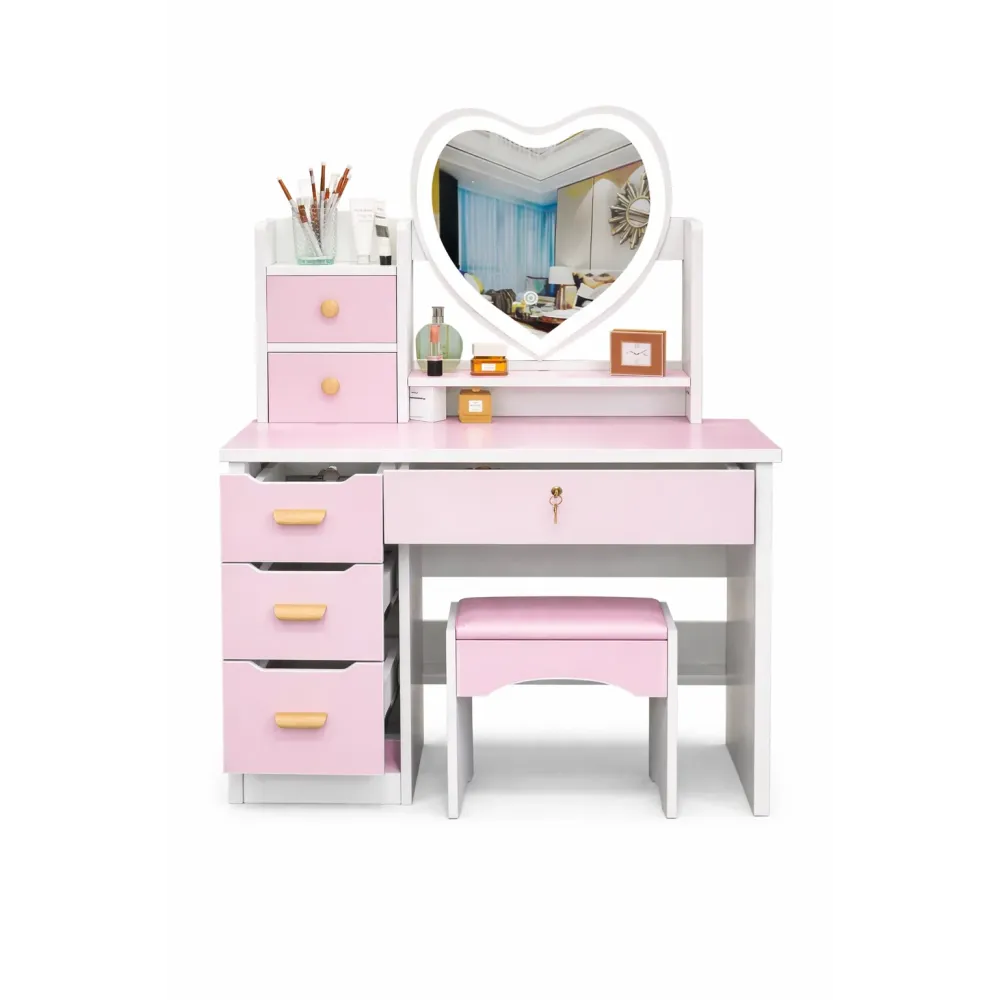 Стол макияжный STL-MD 99 розовый с LED-зеркалом сердце и пуфиком 100 см • Туалетный столик для макияжа с подсветкой, системой хранения, полками и ящиками для спальни, гардеробной и комнаты