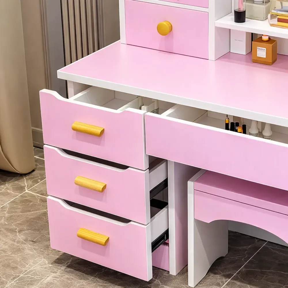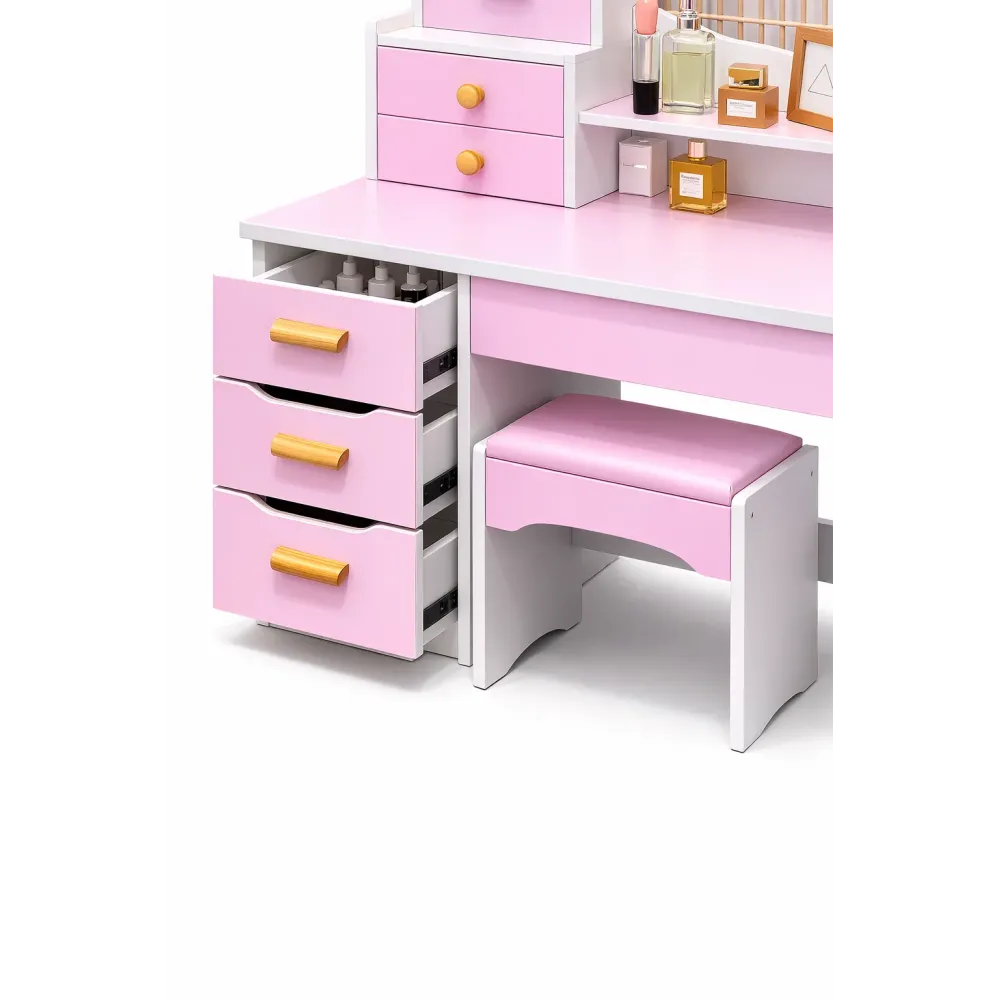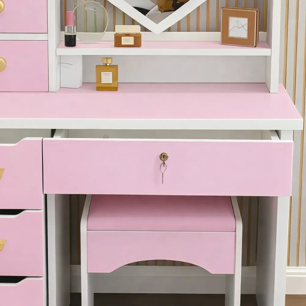 Стол макияжный STL-MD 99 — это яркое и стильное решение для тех, кто хочет создать дома красивую, удобную и функциональную зону для ежедневного ухода за собой. Розовый цвет делает модель особенно выразительной, нежной и привлекательной, благодаря чему такой туалетный столик становится не просто полезной мебелью, а заметным акцентом в интерьере спальни, гардеробной, комнаты или домашнего бьюти-уголка. LED-зеркало в форме сердца придает столику особое настроение и помогает сделать процесс макияжа, ухода за лицом и повседневных сборов более комфортным и приятным.