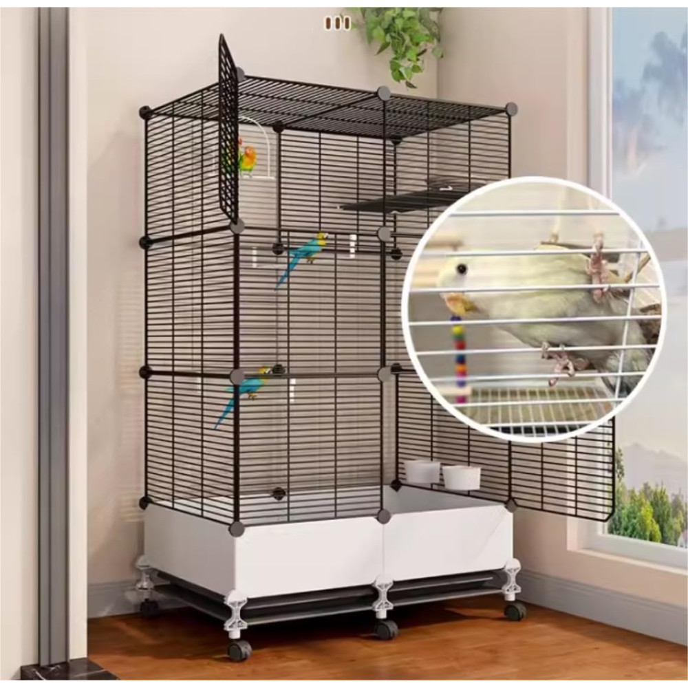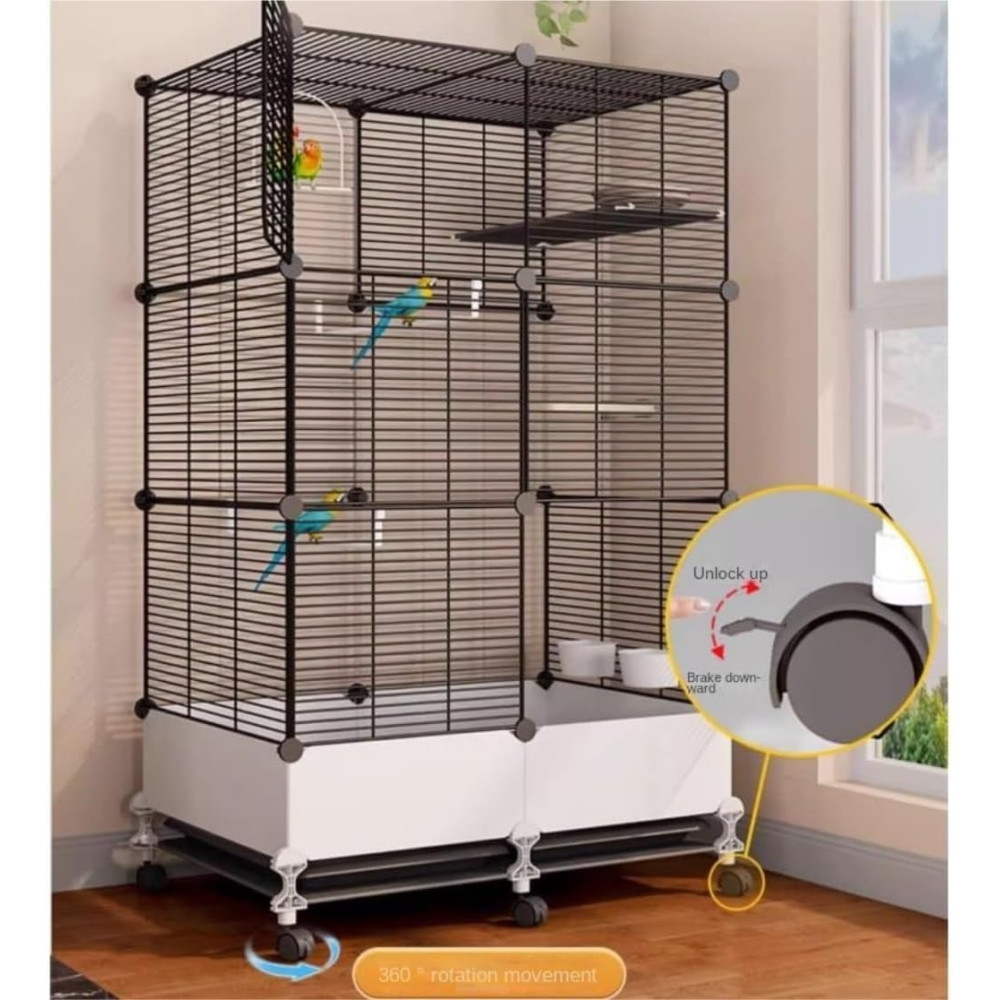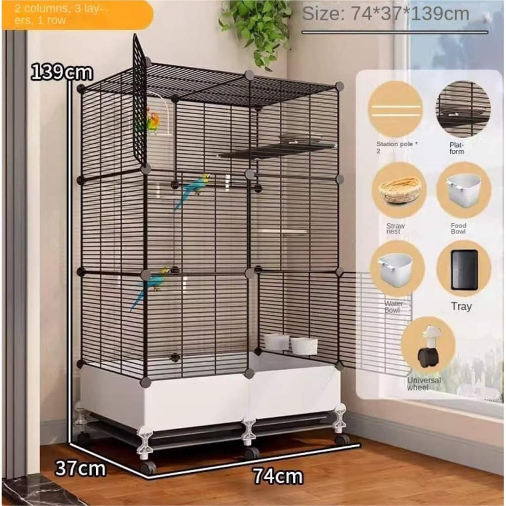 Для развлечения птиц внутри предусмотрены деревянные игрушки, которые стимулируют активность и развитие питомцев. Просторный размер клетки — 74 × 37 × 139 см — обеспечивает достаточно места для полётов, игр и физических упражнений нескольких птиц одновременно