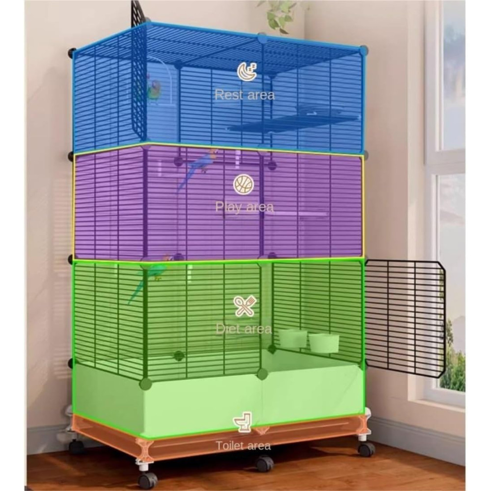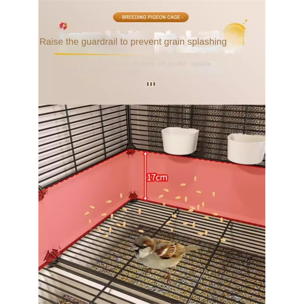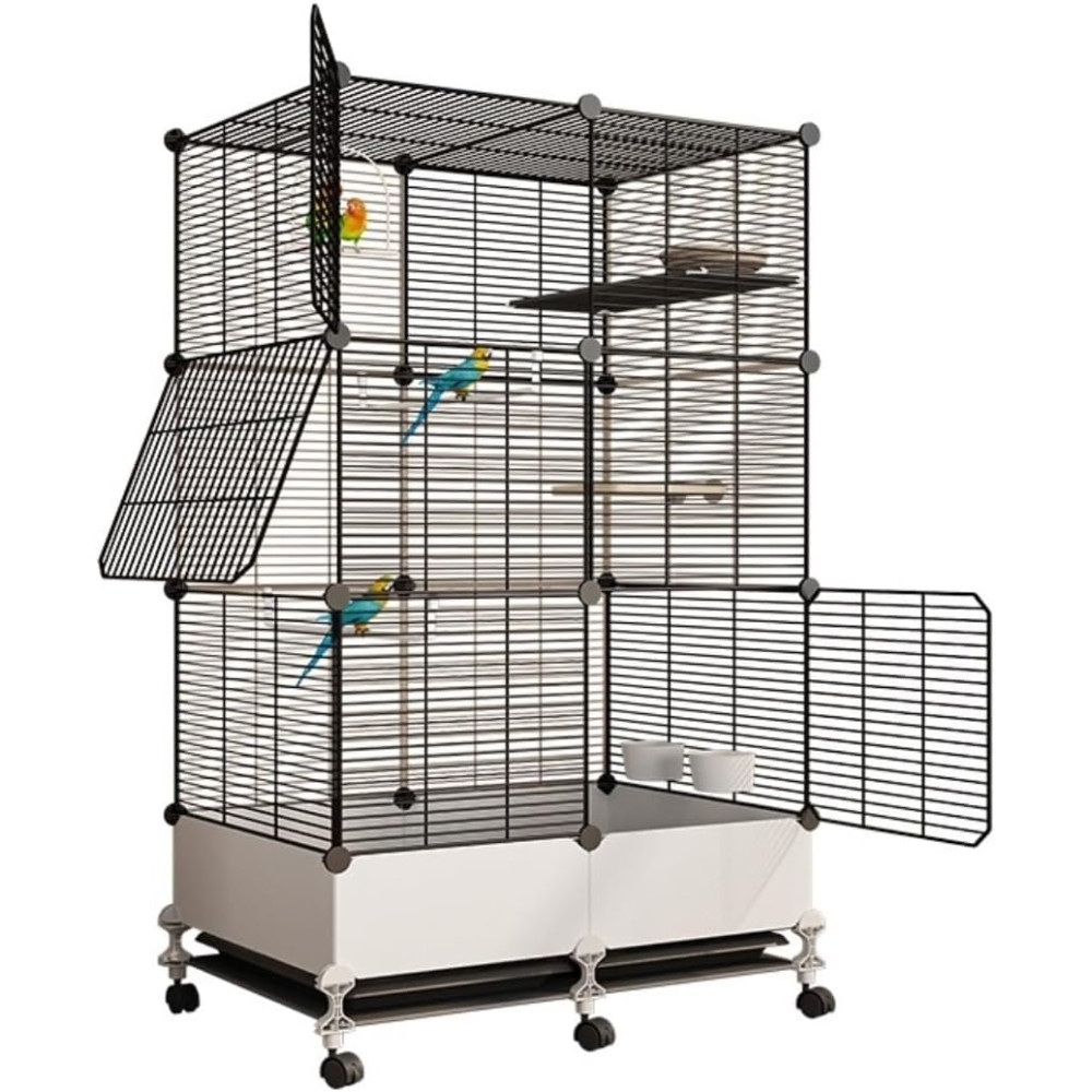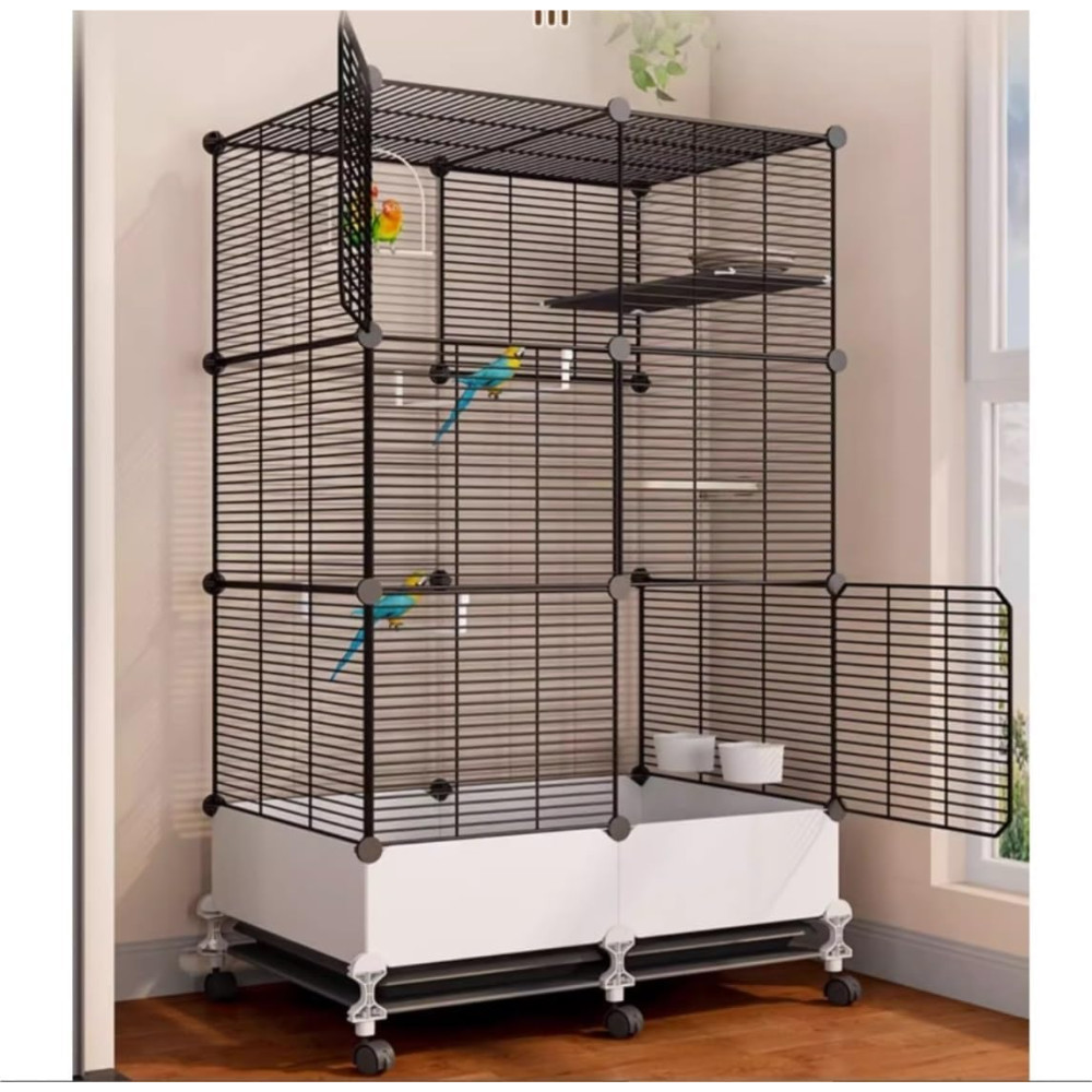 Для развлечения птиц внутри предусмотрены деревянные игрушки, которые стимулируют активность и развитие питомцев. Просторный размер клетки — 74 × 37 × 139 см — обеспечивает достаточно места для полётов, игр и физических упражнений нескольких птиц одновременно