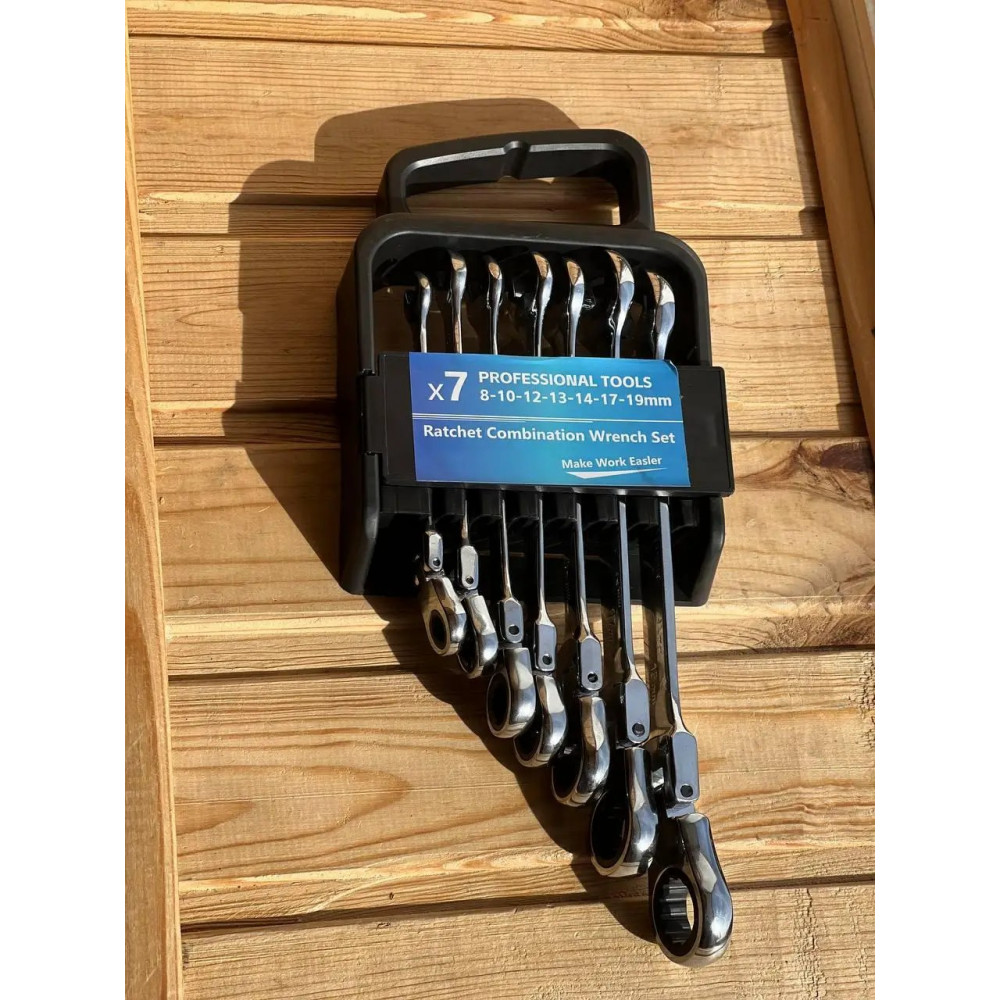Ключи комбинированные трещоточные шарнирные в наборе 7 шт. Wrench set ES-7 – это идеальный инструмент для любой мастерской или домашнего использования. Они удобно расположены в подвеске, что обеспечивает легкий доступ и предотвращает потерю ключей. Специальный наконечник позволяет откручивать винты даже с поврежденной (круглой) головкой, что делает эти ключи незаменимыми в самых сложных ситуациях. Прочный рельсовый механизм из закаленной стали обеспечивает надежность и долговечность, позволяя работать с минимальным усилием.