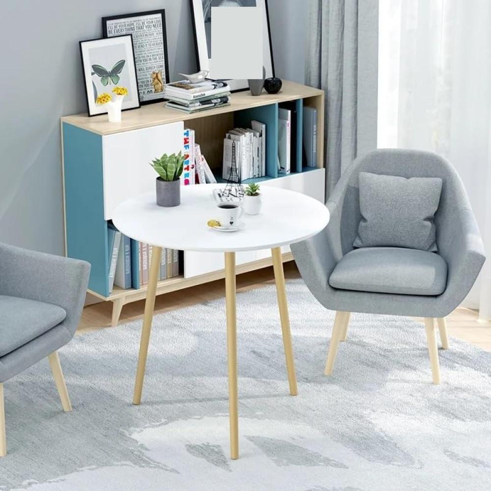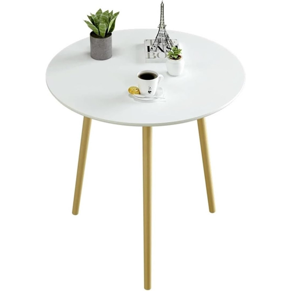 Круглый журнальный столик 1201 выполнен в скандинавском стиле и подходит как кофейный, журнальный или прикроватный столик. Белая столешница в сочетании с золотыми ножками придает изделию лёгкость и современный вид, а три устойчивые ножки обеспечивают надежную опору