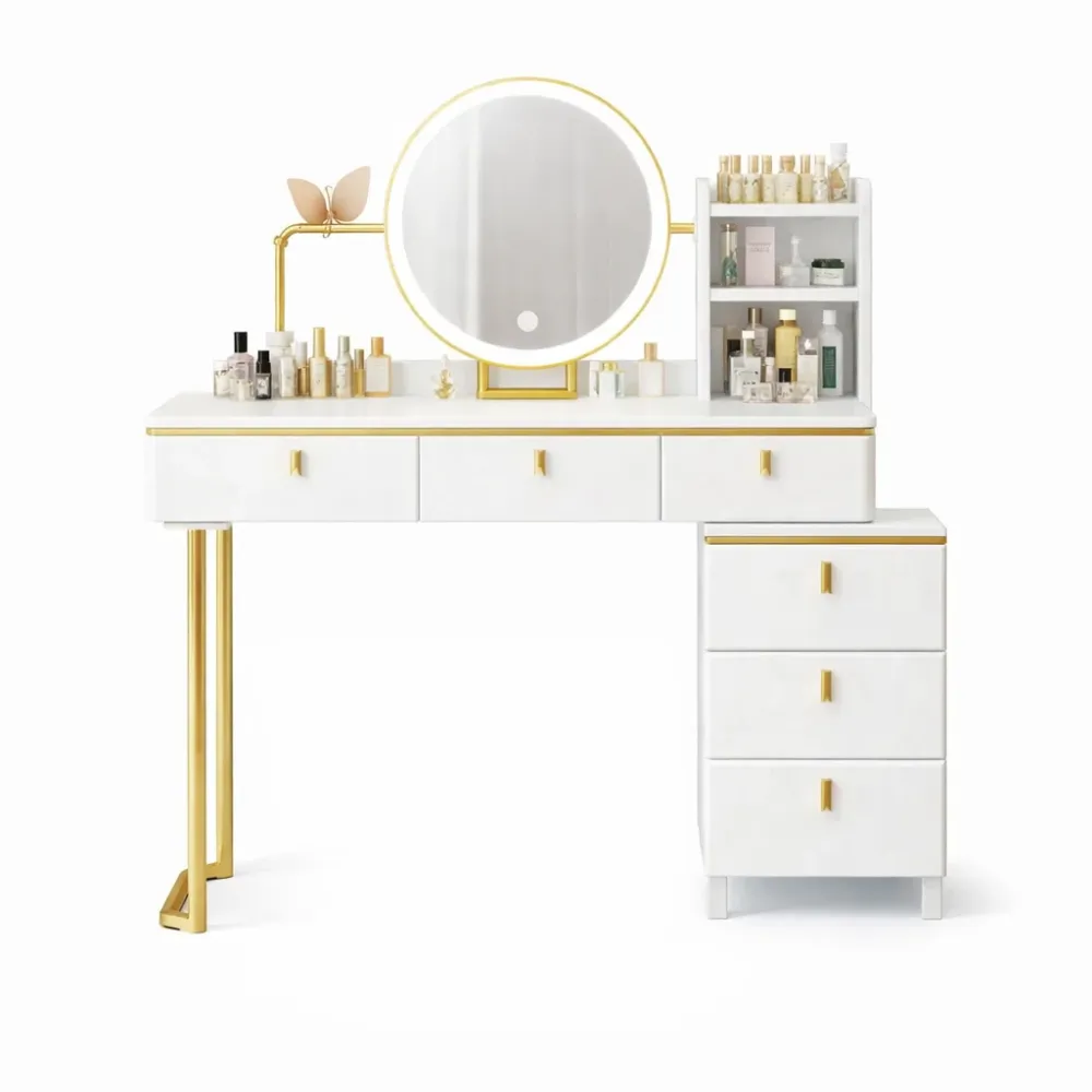 Макияжный стол с круглым LED-зеркалом и тумбой STL-MD 106 • Белый туалетный столик для макияжа, хранения косметики и спальни 120×140×40 см