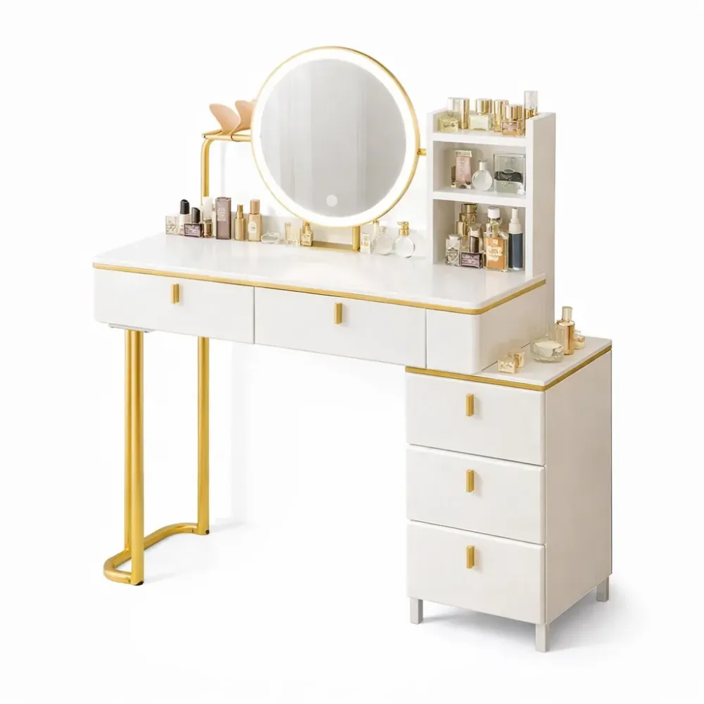 Макияжный стол STL-MD 106 — это стильное и продуманное решение для тех, кто хочет собрать красивую и удобную бьюти-зону в спальне, гардеробной или другой комнате. Модель сочетает просторную столешницу, встроенную тумбу, круглое LED-зеркало и систему хранения, чтобы все необходимое для макияжа, ухода и укладки всегда находилось под рукой. За счет светлого оформления, аккуратных линий и функциональной конструкции такой стол помогает создать эстетичное пространство без ощущения перегруженности.