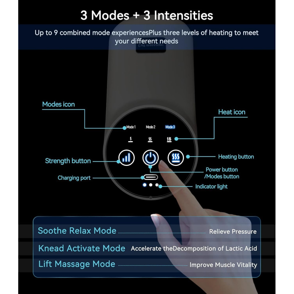 • 9 режимов работы: 3 режима интенсивности компрессионного массажа, 3 режима вибрации и 3 режима нагрева