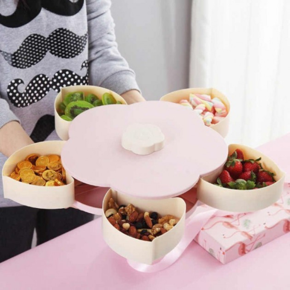 Вращающаяся тарелка для закусок и сладкого выглядит в форме цветка, и дополнит любой праздничный стол. Имеет 5 выдвижных лепестков, в которые вы сможете положить разнообразную закуску, фрукты, сладости, сыры и многое другое. Вращающаяся коробка для хранения сладостей и закусок станет центром притяжения гостей и близких, а еще она просто незаменима для фондю.