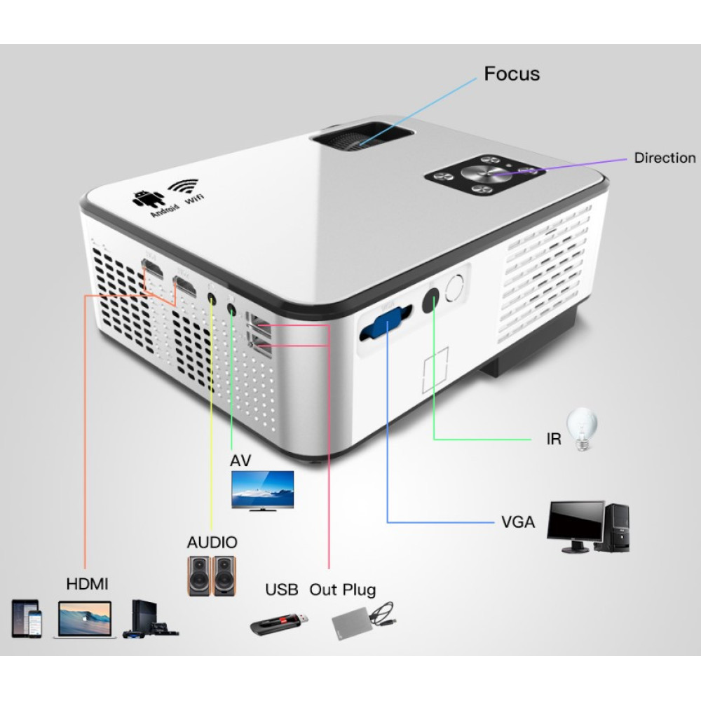 В базовой версии проектора вас встречает интуитивно понятное меню, с минимальным количеством настроек. Достаточно подключить внешний носитель, например флешку или внешний жесткий диск, подождать пока проектор его определит, выбрать необходимый файл и воспроизвести его нажатием кнопки Play на пульте ДУ. Также, при необходимости, можно подключить компьютер или ноутбук по средствам HDMI или VGA портов. Проектор радует запасом яркости и при установке до 3-4 метров до проекционного экрана выдает вполне сочную и четкую картинку. Версия с ОС Android 6.0 более универсальная и обладает всеми плюсами и фишками современного устройства, в том числе поддержкой потокового видео со смартфона или планшета. Проектор можно установить, как на любую ровную поверхность, так и на кронштейн, на нижней части для этого предусмотрена специальная резьба.