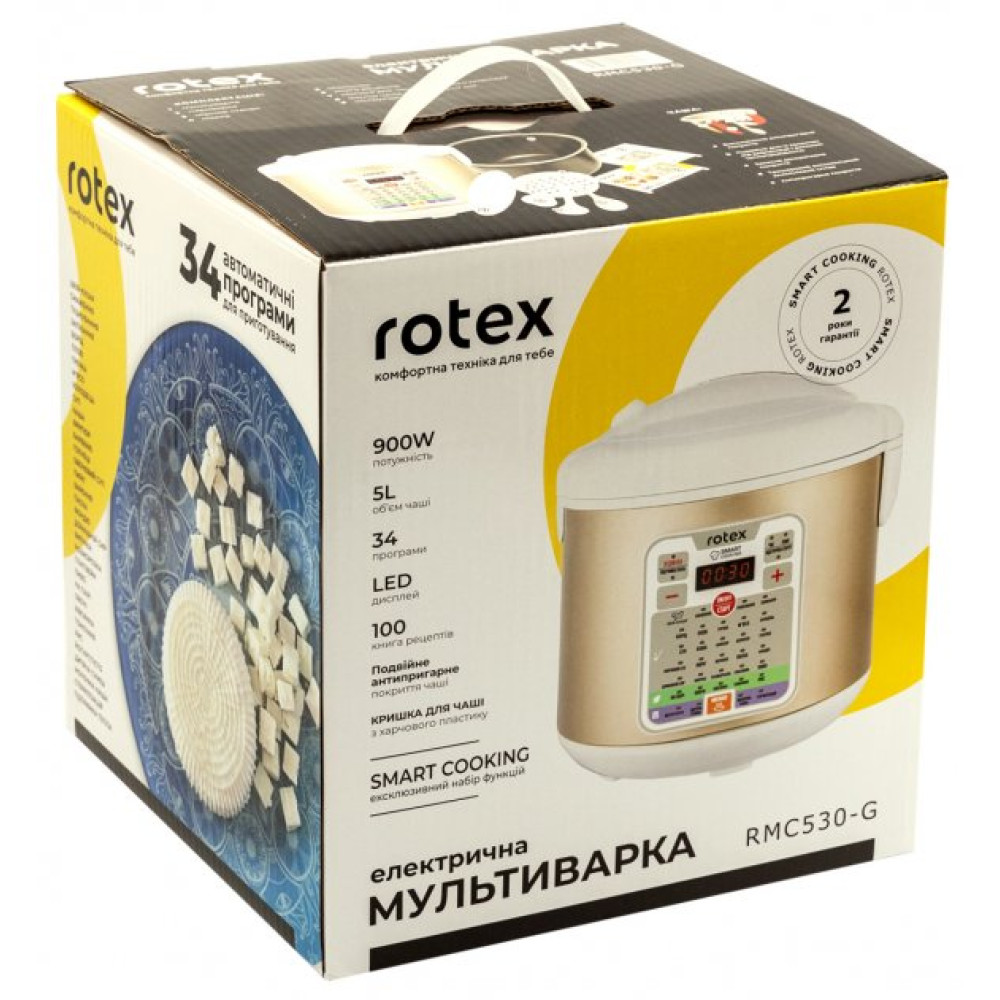 Rotex RMC530-G — многофункциональная мультиварка с набором функций Smart Cooking, а именно: регулирование времени и температуры, режим Stand by, управление функцией автоподогрева, отсрочка старта.