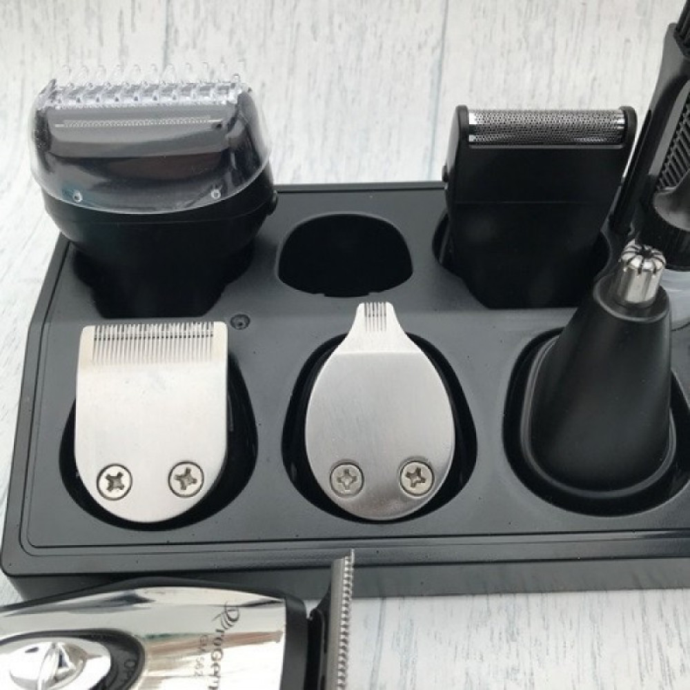Машинка для стрижки укомплектована сменными насадками: бритвенная, для носа и ушей, для регулировки длины.