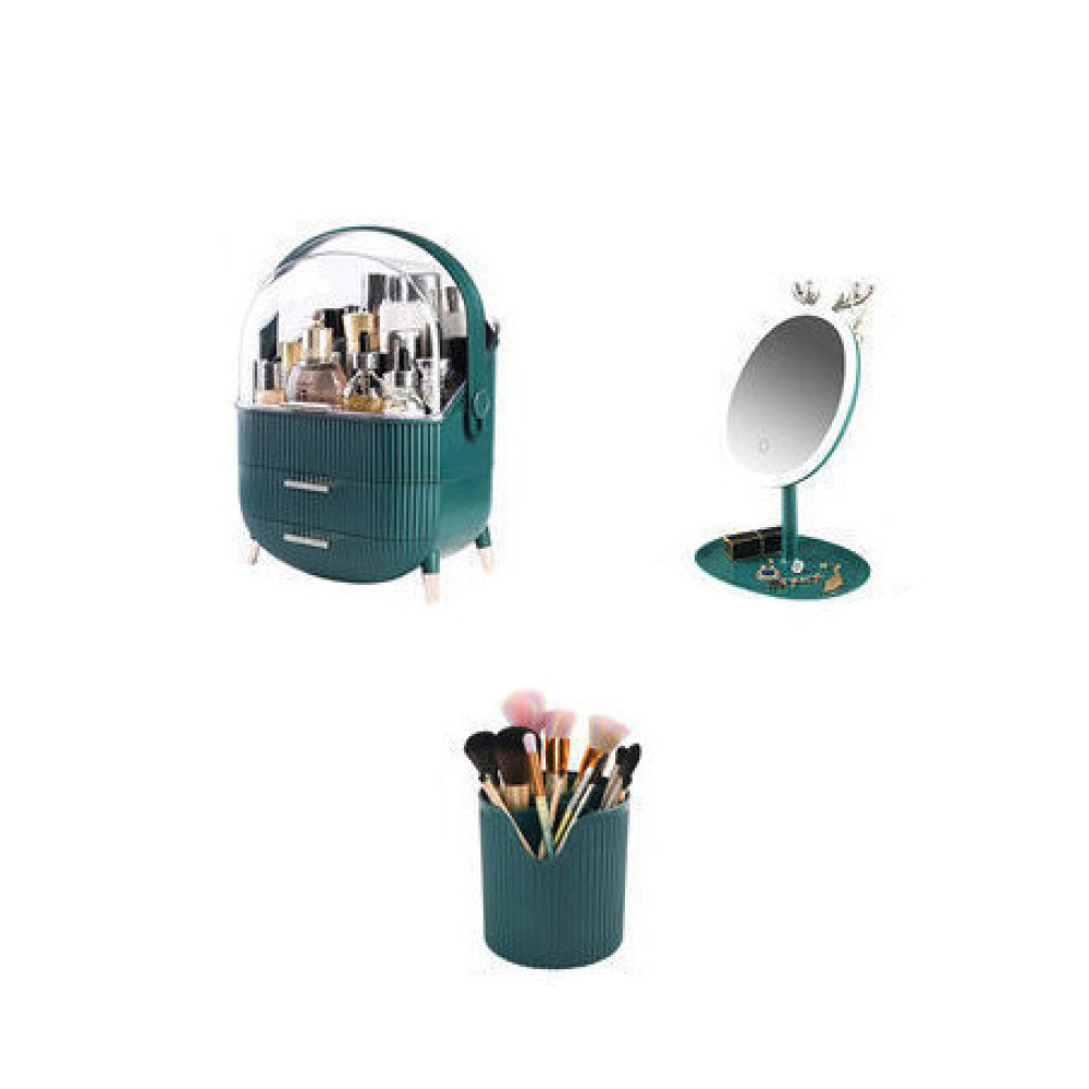 Набор для макияжа 3 в 1 · LED зеркало / Органайзер для косметики / Стакан для кисточек идеально подойдет для компактного хранения косметических средств. Зеркало с подсветкой облегчит нанесение макияжа. Удобный стакан для хранения кистей.