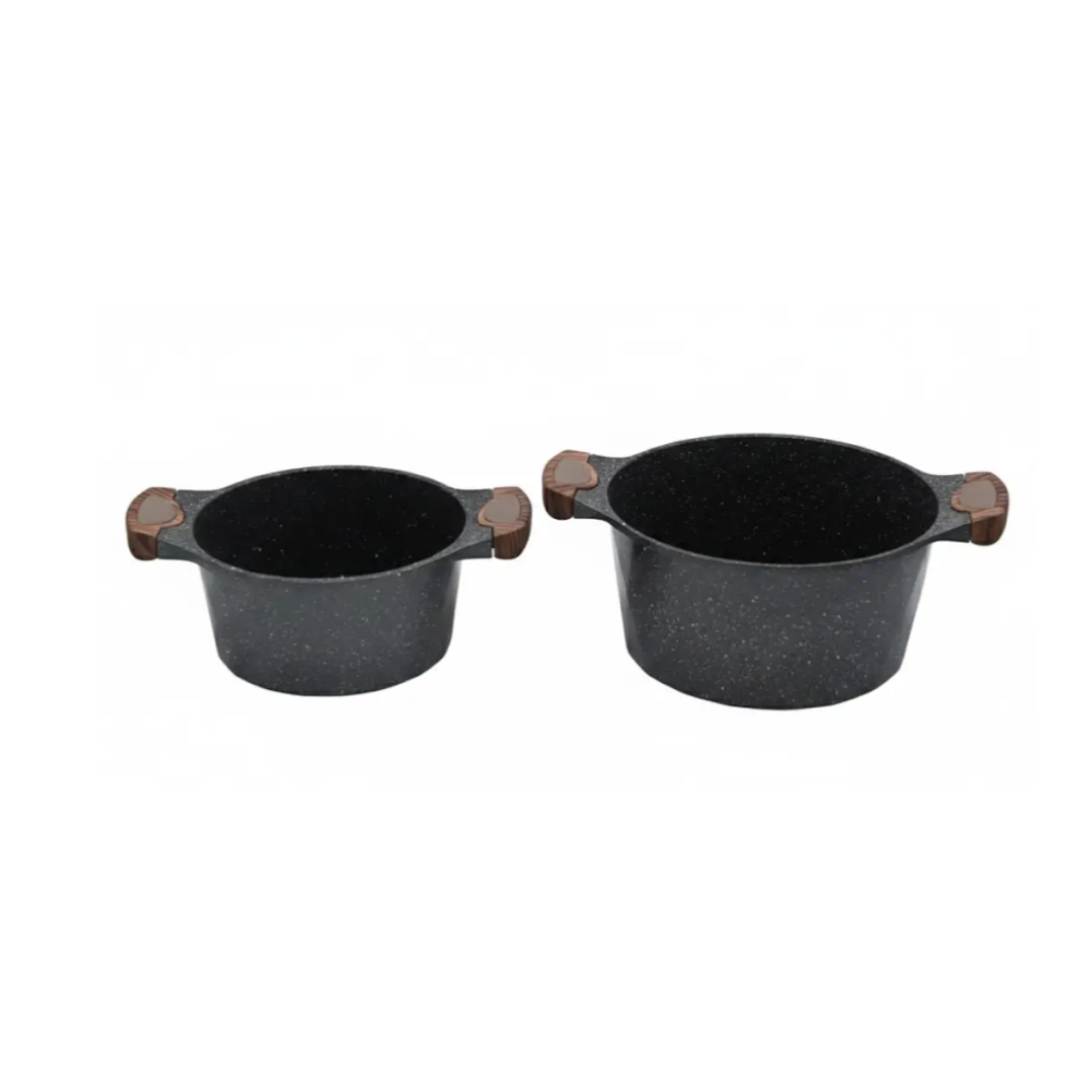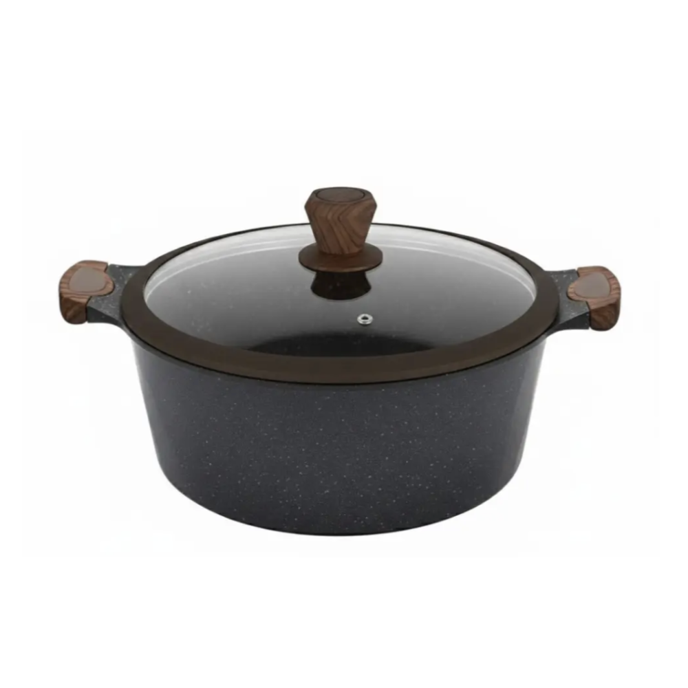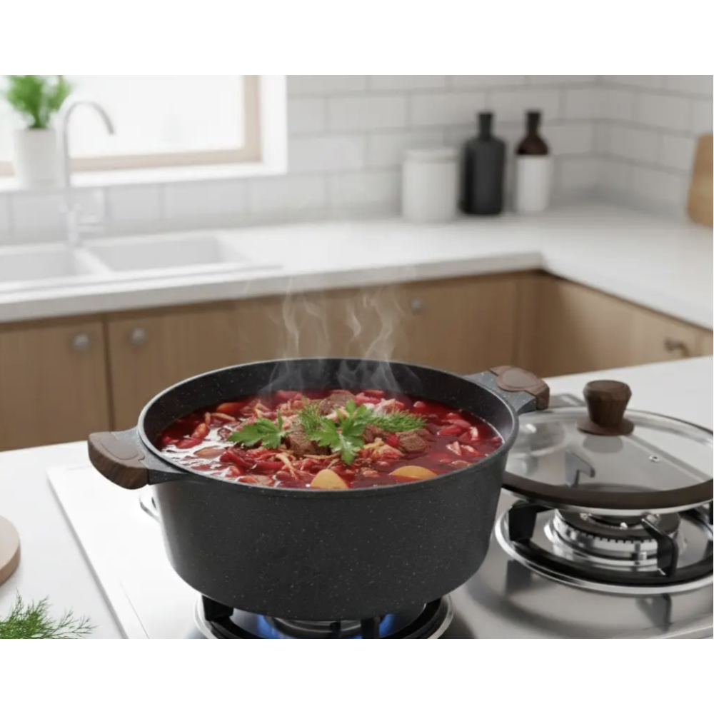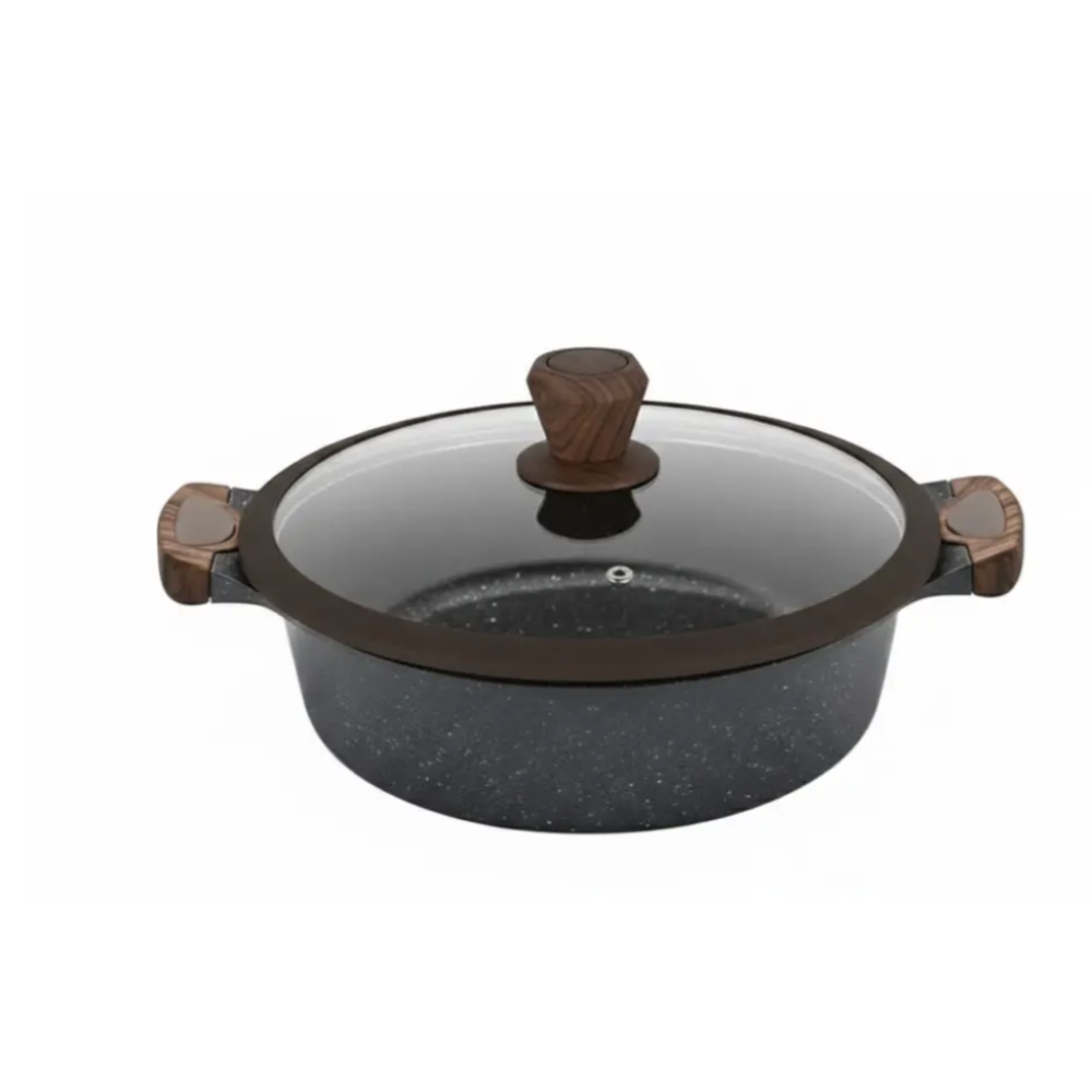 Корпус выполнен из литого алюминия, который обеспечивает равномерное распределение тепла и быстрое приготовление. Внутреннее гранитное антипригарное покрытие предотвращает пригорание и облегчает уход. Термостойкие стеклянные крышки с отверстием для выхода пара помогают сохранять аромат и вкус блюд