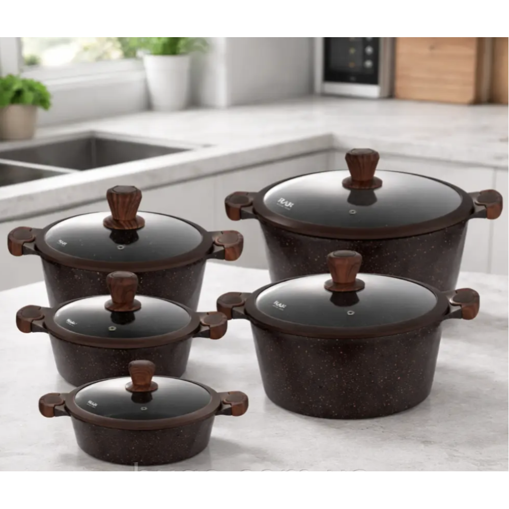 Набор кастрюль RAF R.80004 в коричневом цвете — это практичное и элегантное решение для современной кухни. Комплект из 5 кастрюль с крышками позволяет легко готовить разнообразные блюда: от супов и гарниров до тушёных и томлёных рецептов