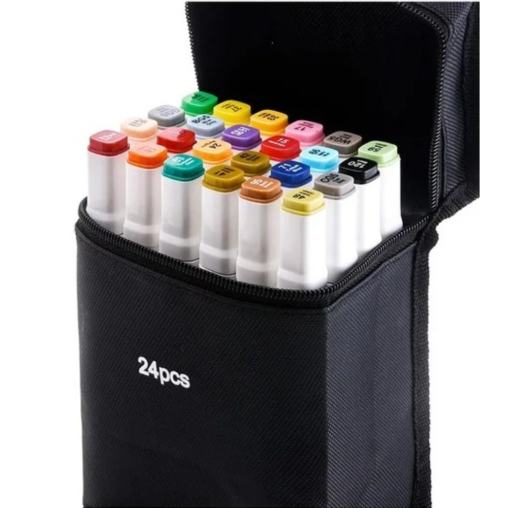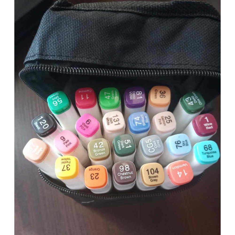 Маркеры для рисования и скетчей в черном тканевом футляре. Двусторонние, на спиртовой основе.