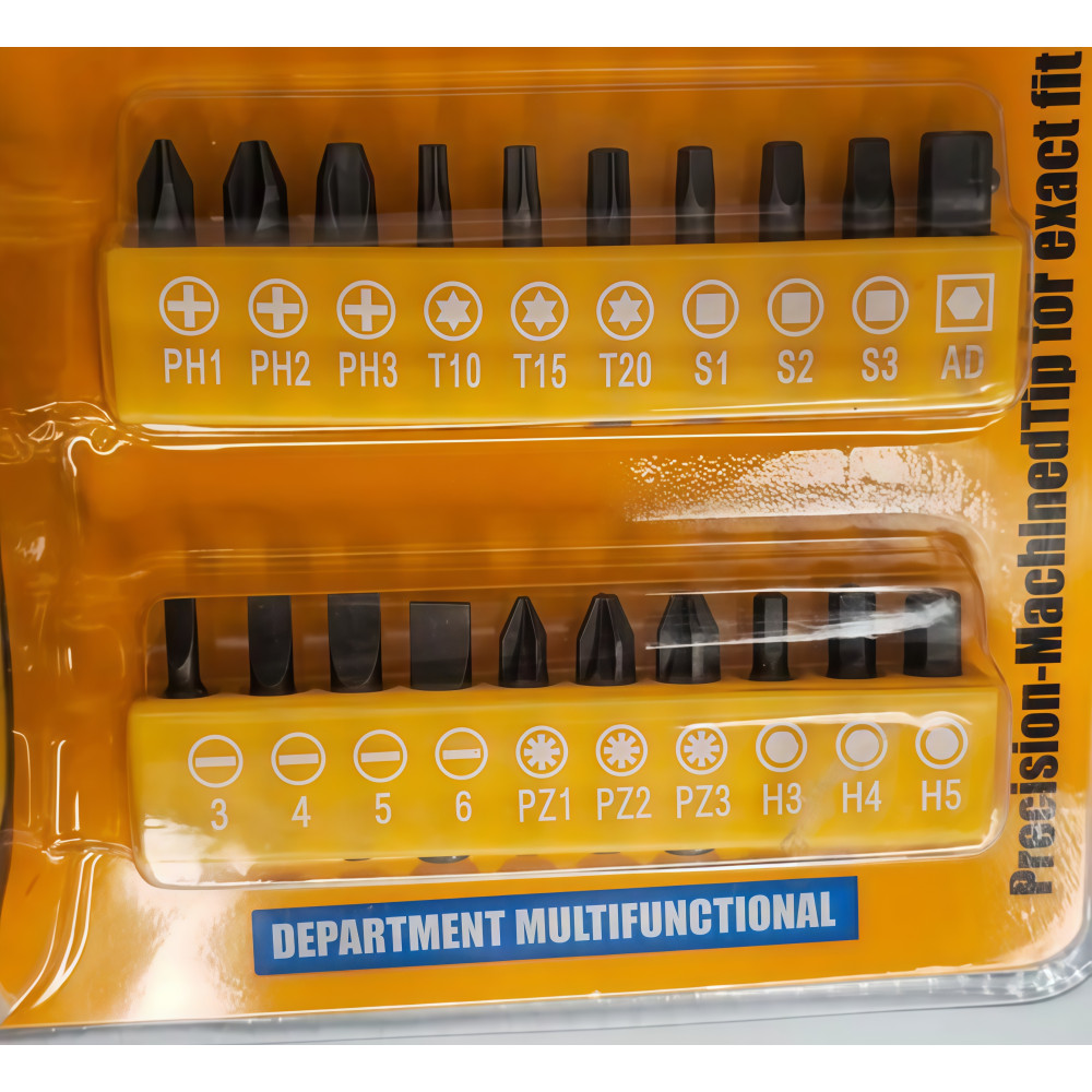 Комплект включает отвертку с удобной рукояткой и сменные насадки разных типов и размеров, что позволяет работать с различными крепежными элементами.