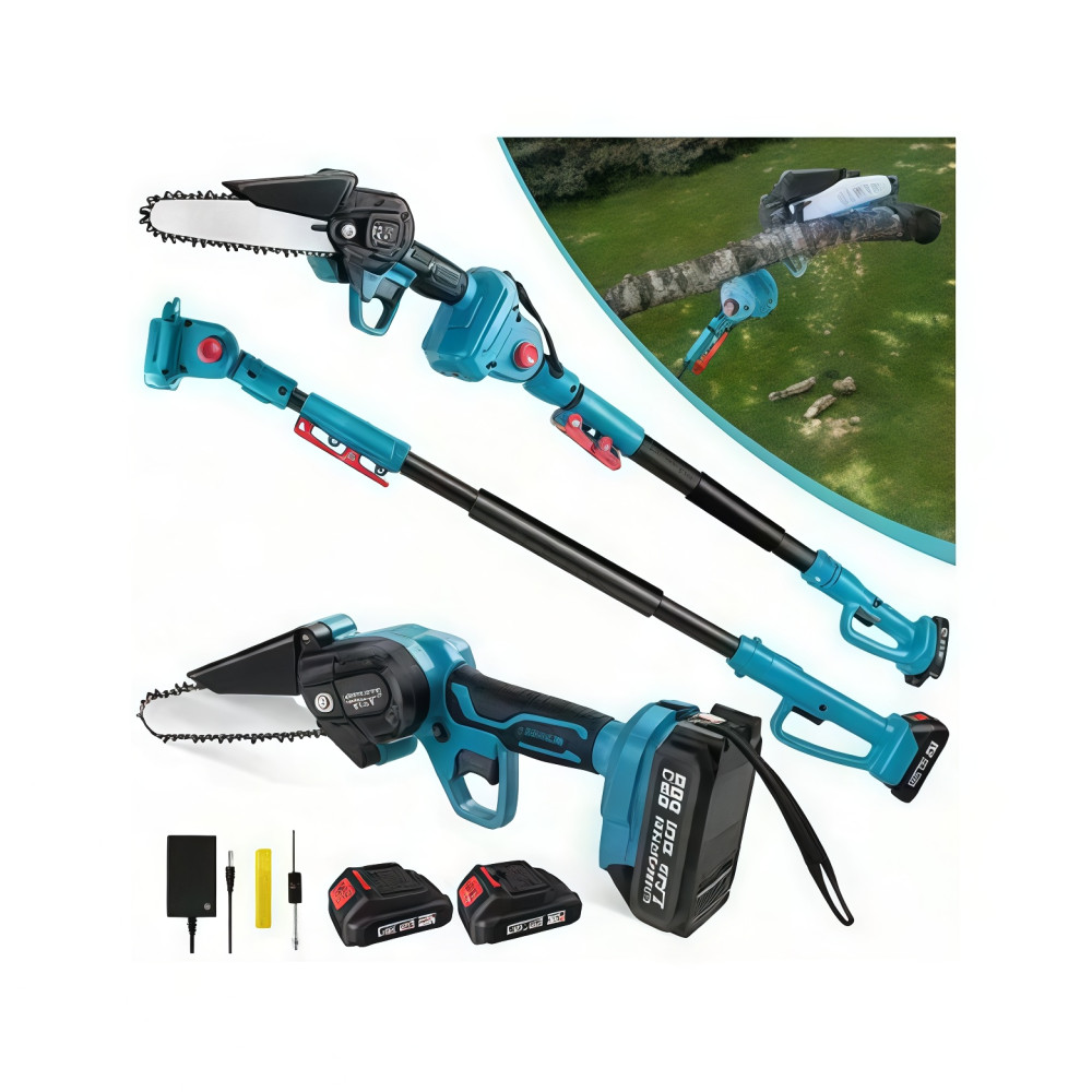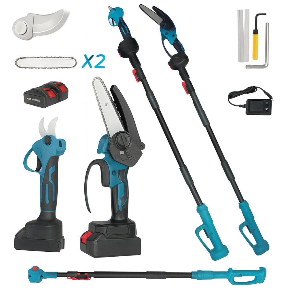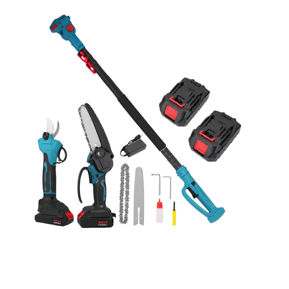 Сделайте уход за садом лёгким и эффективным с набором 3в1. В комплект входит аккумуляторная мини-пила 6", секатор и телескопическая штанга, позволяющая работать даже с труднодоступными ветками.
