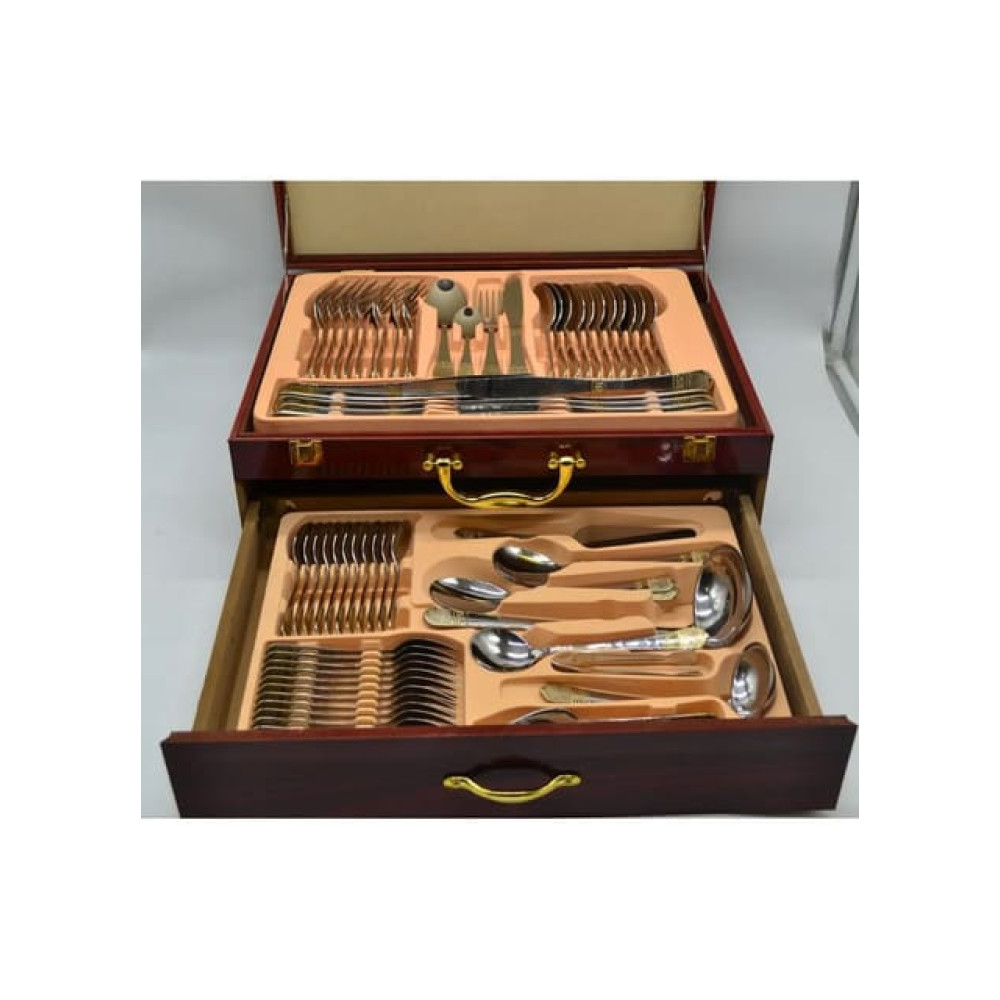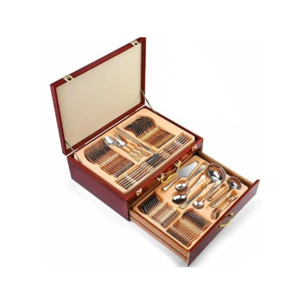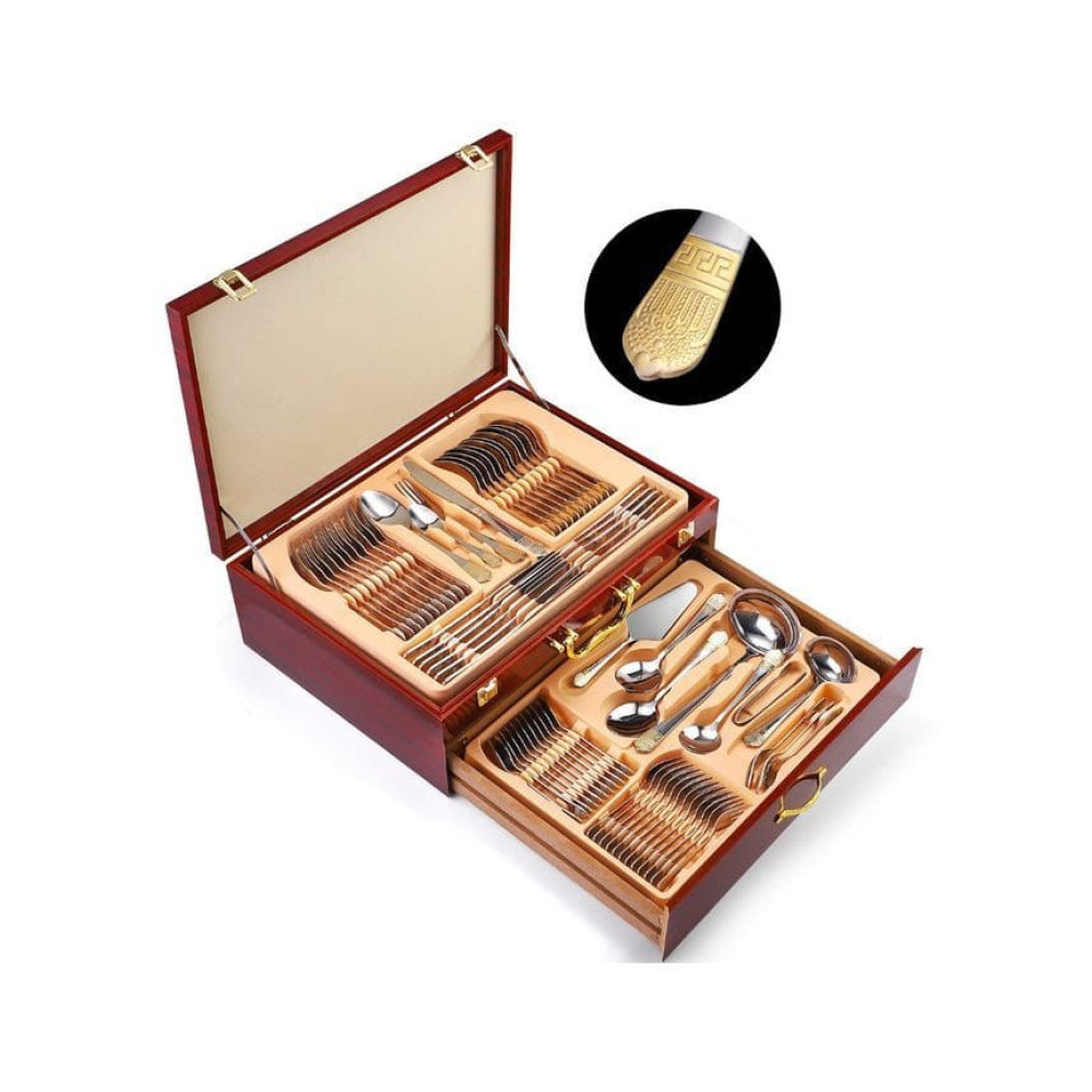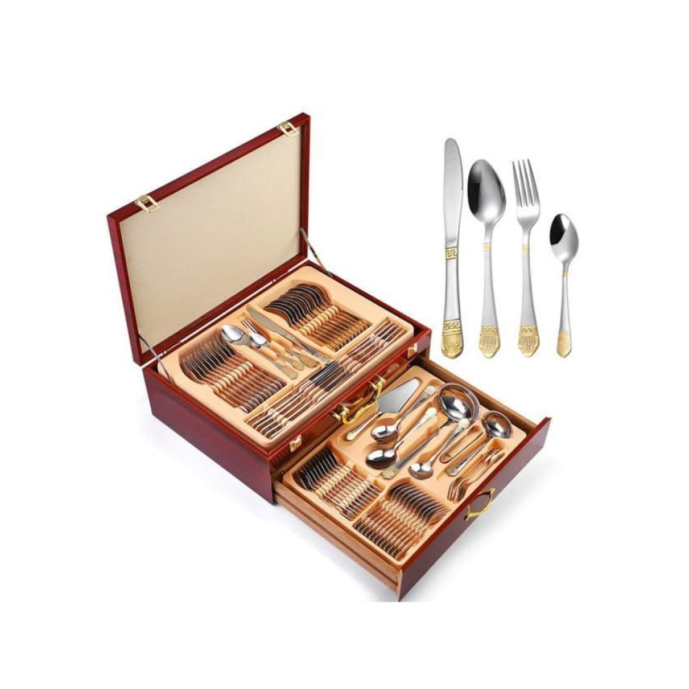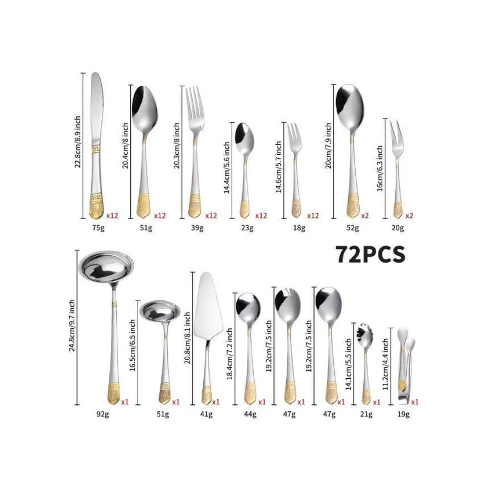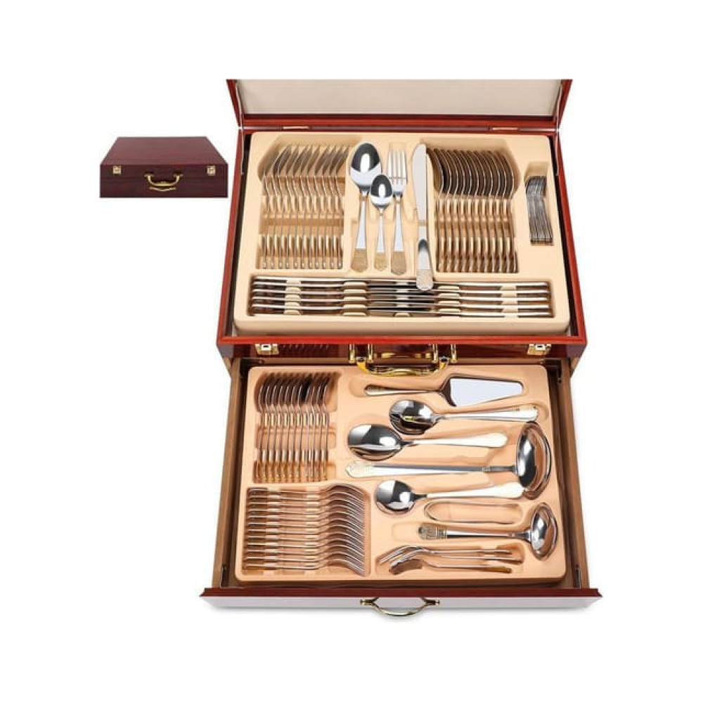 Набор рассчитан на 12 персон и включает 72 предмета, включая сервировочные приборы. Поставляется в подарочном кейсе, что делает его отличным вариантом для подарка на свадьбу, юбилей или новосел
