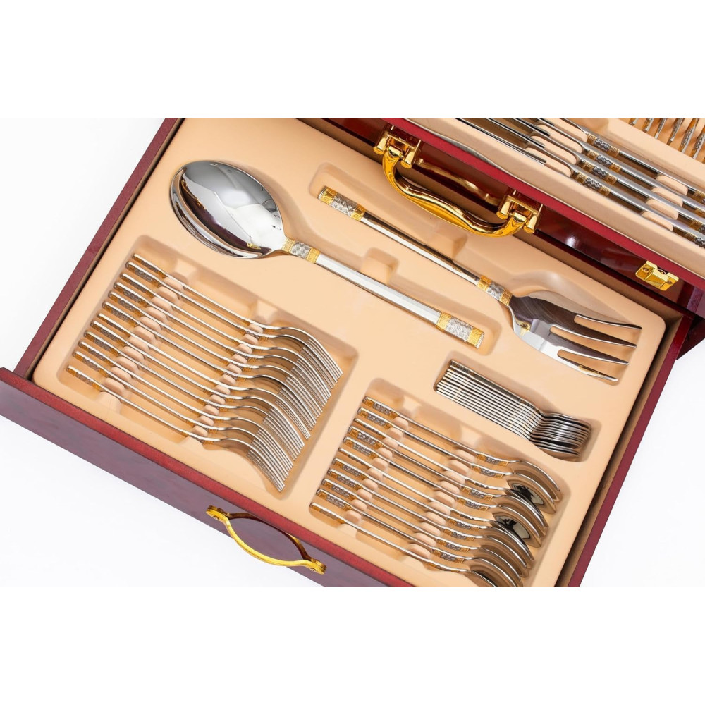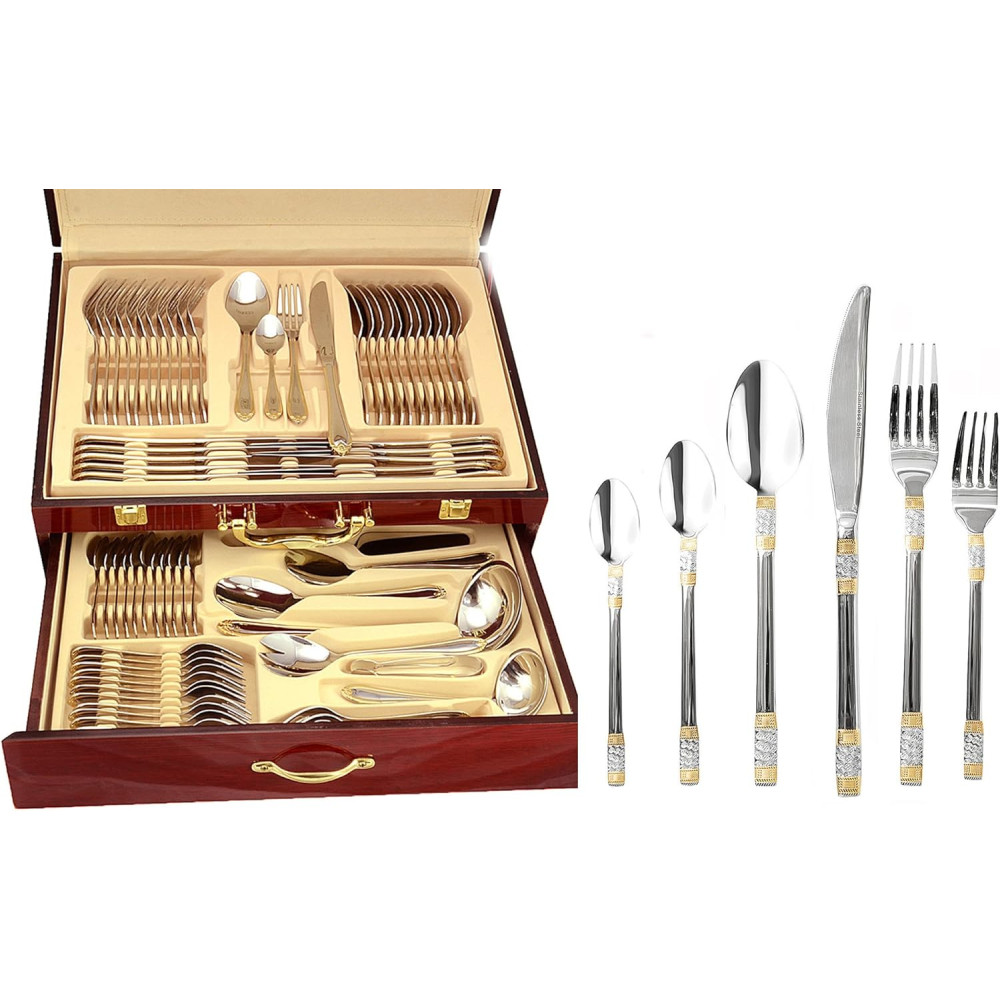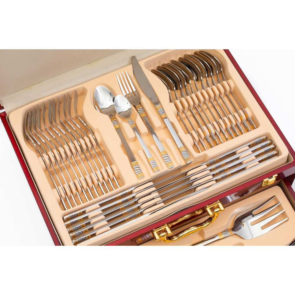 Набор рассчитан на 12 персон и включает 72 предмета, включая сервировочные приборы. Поставляется в подарочном кейсе, что делает его отличным вариантом для подарка на свадьбу, юбилей или новоселье