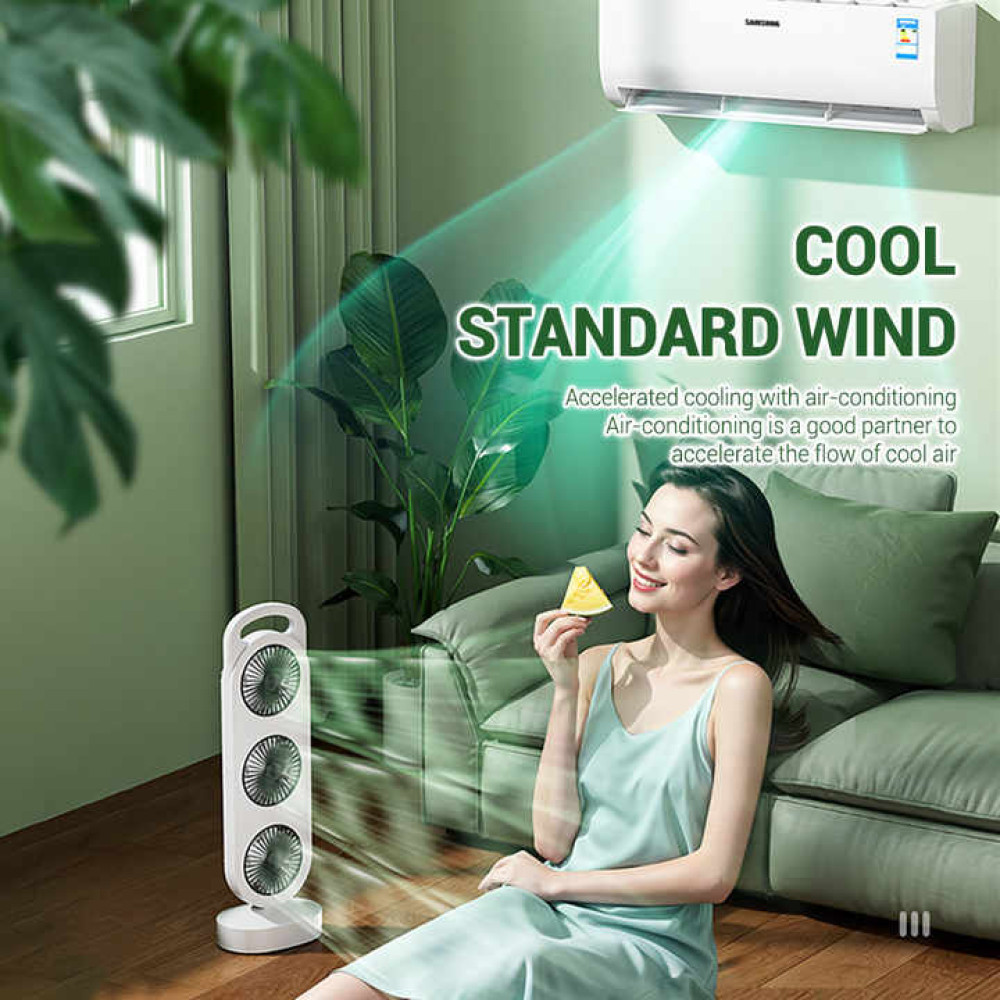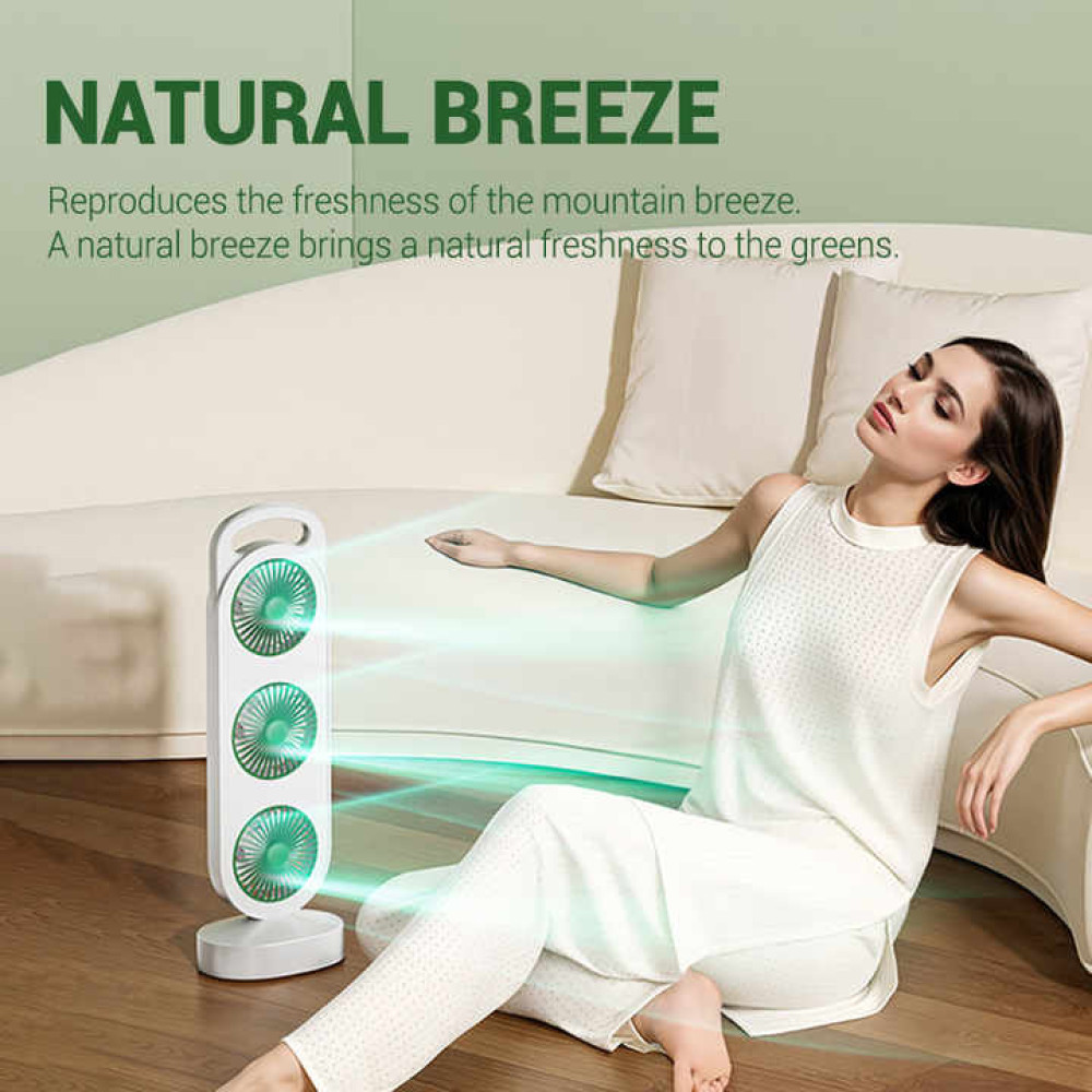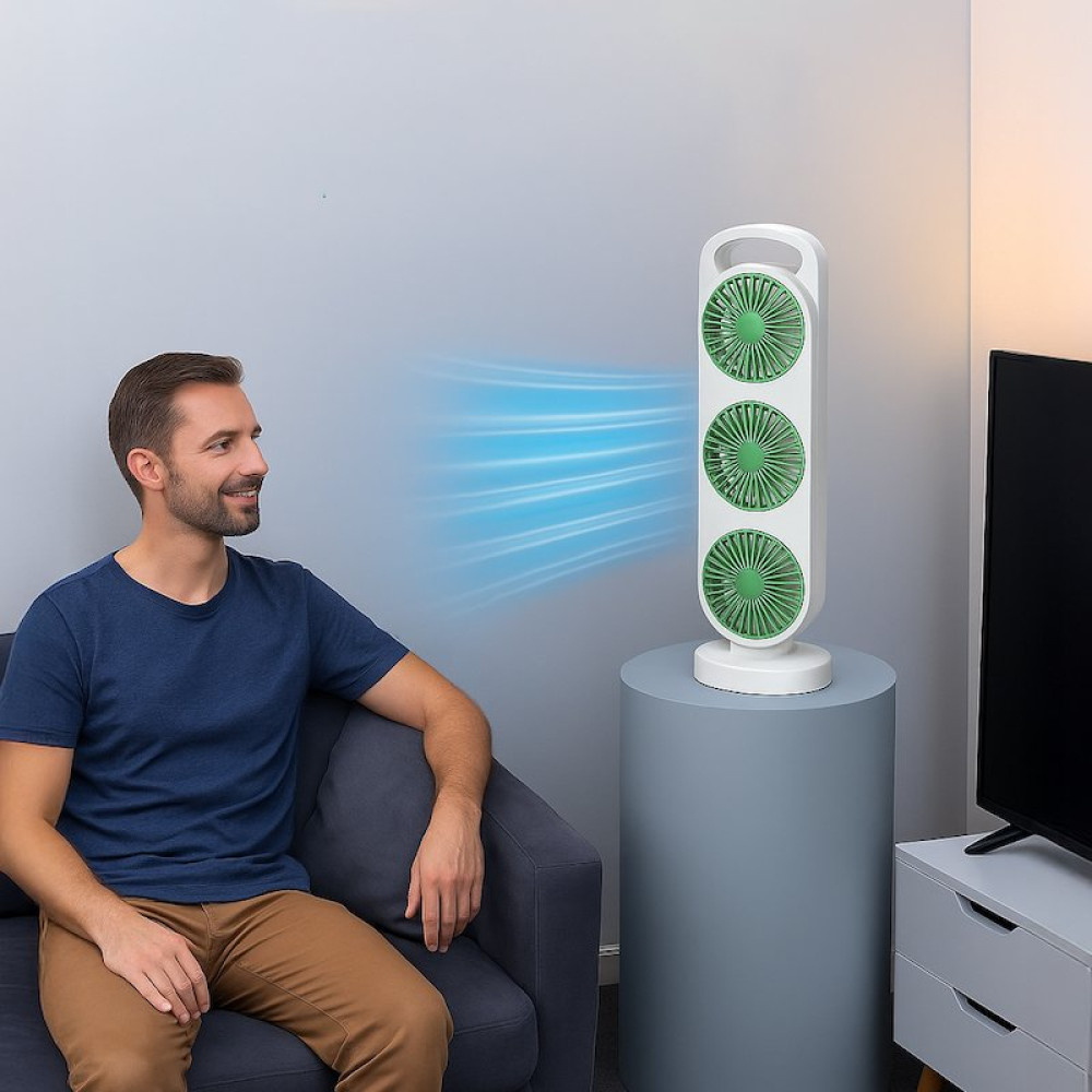 Нужна мощная и компактная система охлаждения для дома, офиса или автомобиля? Вентилятор AND LY-856 / S-31 с тремя поворотными головками создаёт эффект направленного обдува с разных сторон, обеспечивая равномерную циркуляцию воздуха даже в жару. Устройство работает от встроенного аккумулятора и заряжается через USB Type-C — просто подключите к ноутбуку, пауэрбанку или адаптеру