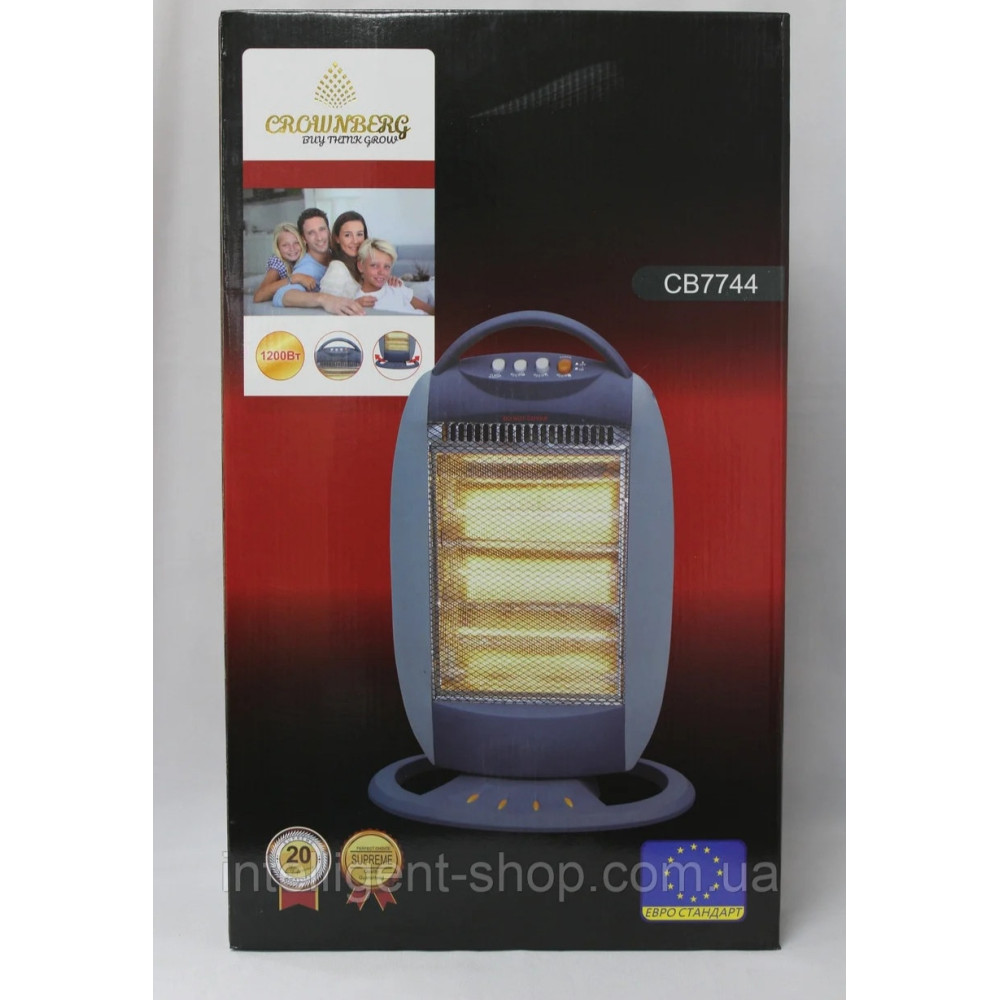 Обогреватель инфракрасный галогенный Heater CB-7744 Halogen Crownberg 1200 Вт палеогеновый обогреватель с индивидуальной формой прогрева помещения нагревает предметы, которые передают свое тело в воздух, это намного безопаснее и быстрее, чем прогрев дуйчиками, ведь они нагревают воздух, а предметы в комнате остаются холодными. Главными преимуществами галогенных обогревателей являются моментальная работа без предыдущего нагрева прибора, уникальный направленный обогрев согревает намного быстрее дуйчиков или конвекторов, способен на минимальной мощности нагреть комнату до комфортной температуры, является эффективным в открытых и сырых помещениях.