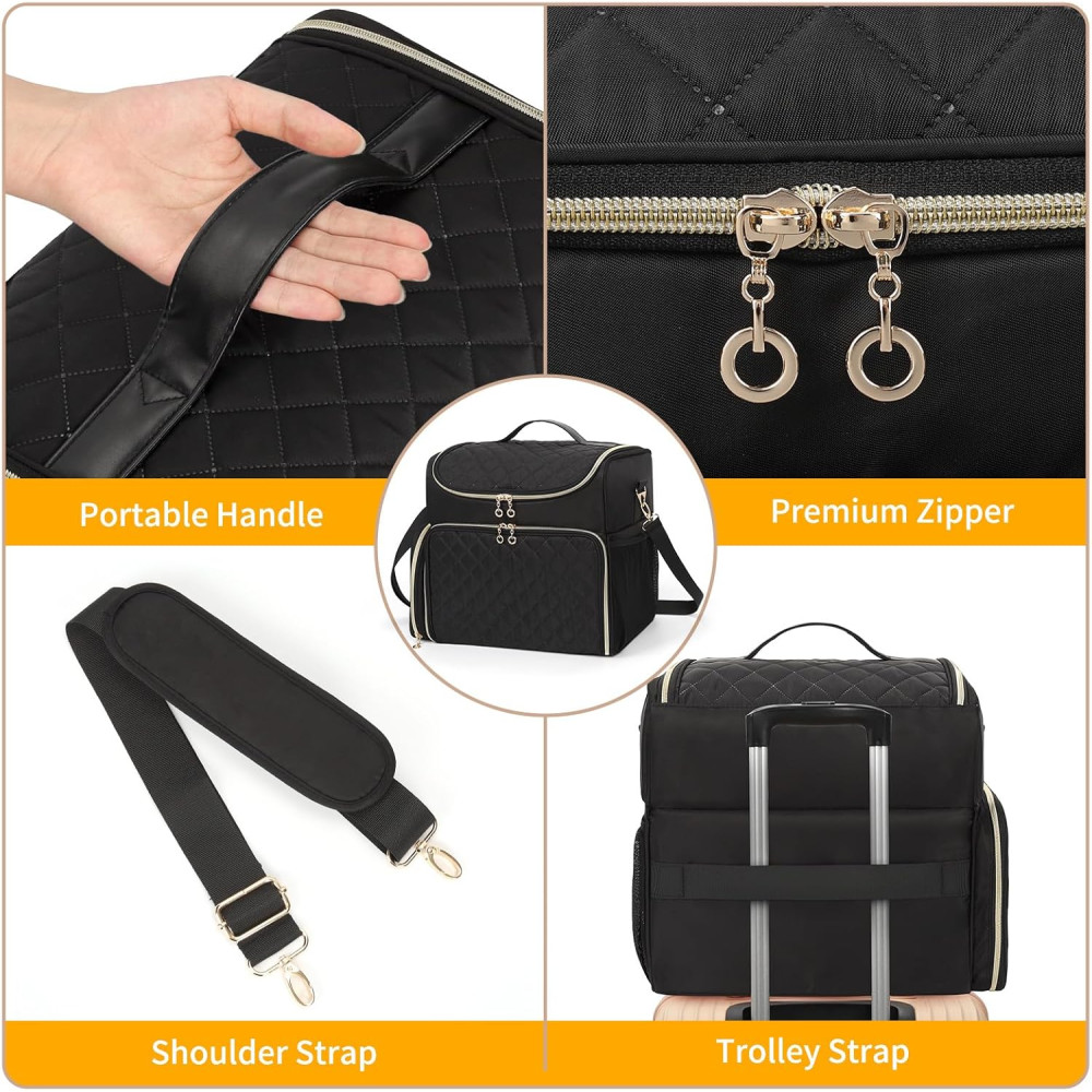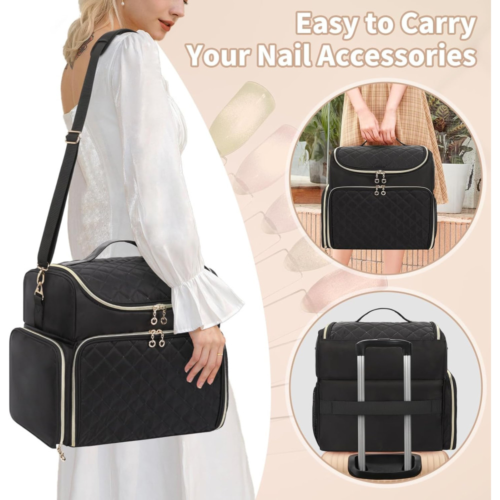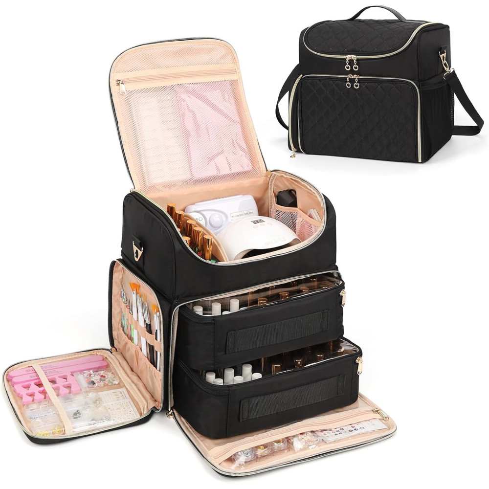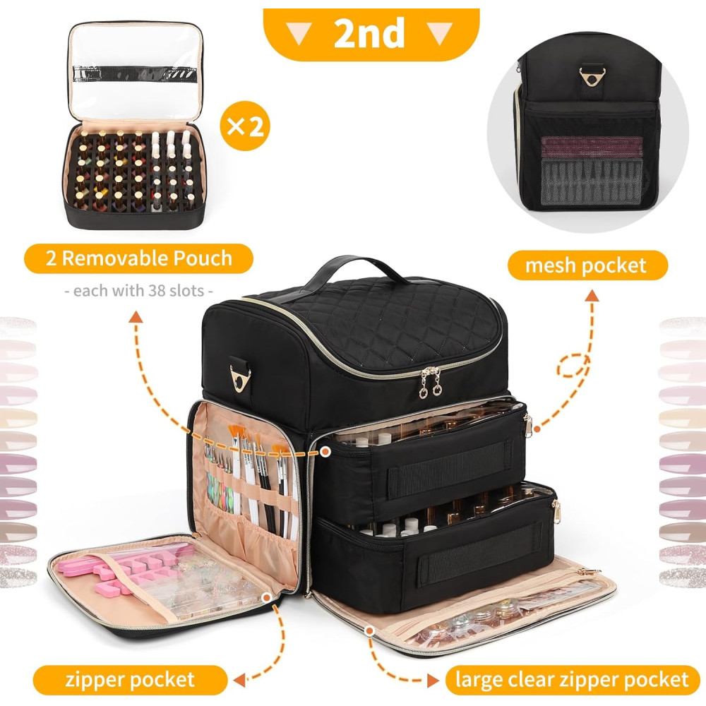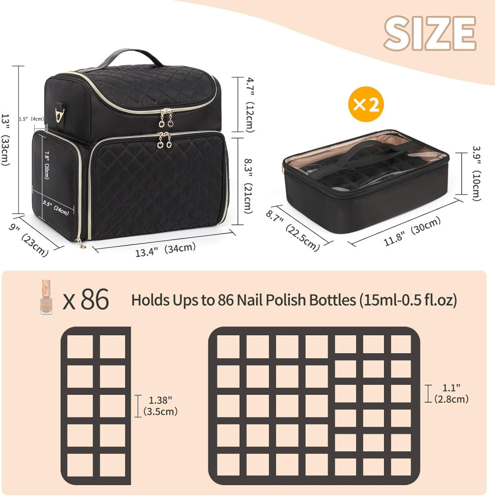 Прочный нейлоновый органайзер с мягкой, плотной набивкой надежно защищает флаконы с лаком и инструменты от ударов и трения. Нижний уровень вмещает до 40 бутылочек с лаком благодаря съемным футлярам с гибкими разделителями, а в верхнем отделении удобно разместятся лампы для лака, жидкости для снятия лака и другие необходимые средства