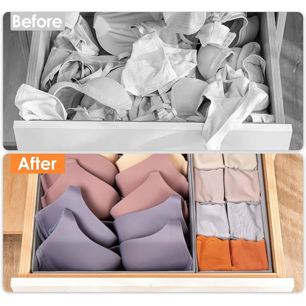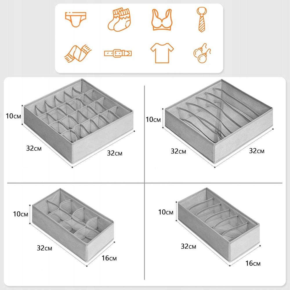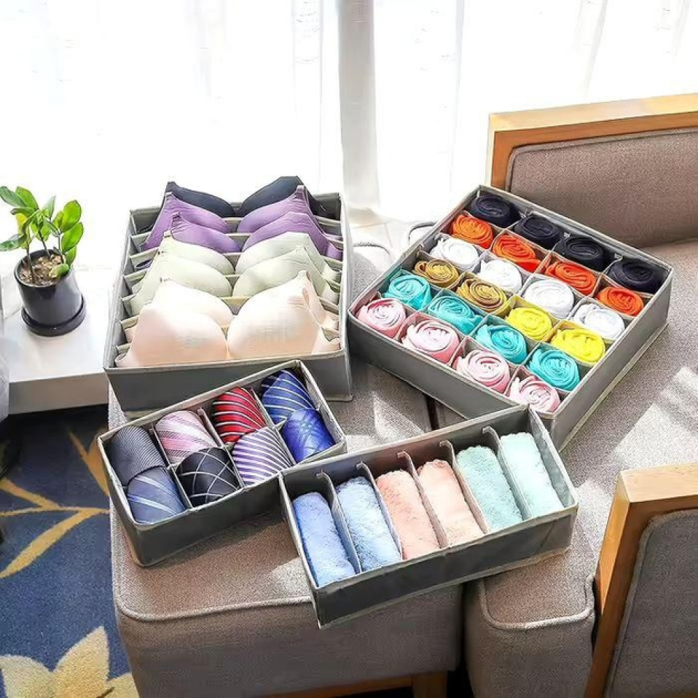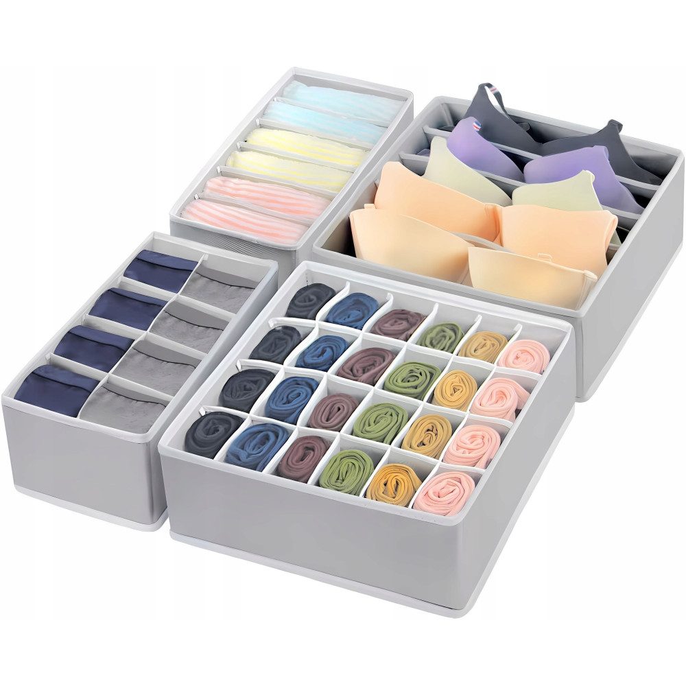 Набор из 4 органайзеров XL-1090 предназначен для удобного хранения нижнего белья и других мелких вещей в ящиках или шкафах. Складные органайзеры с отделениями позволяют легко находить нужные вещи и поддерживать порядок в гардеробе.