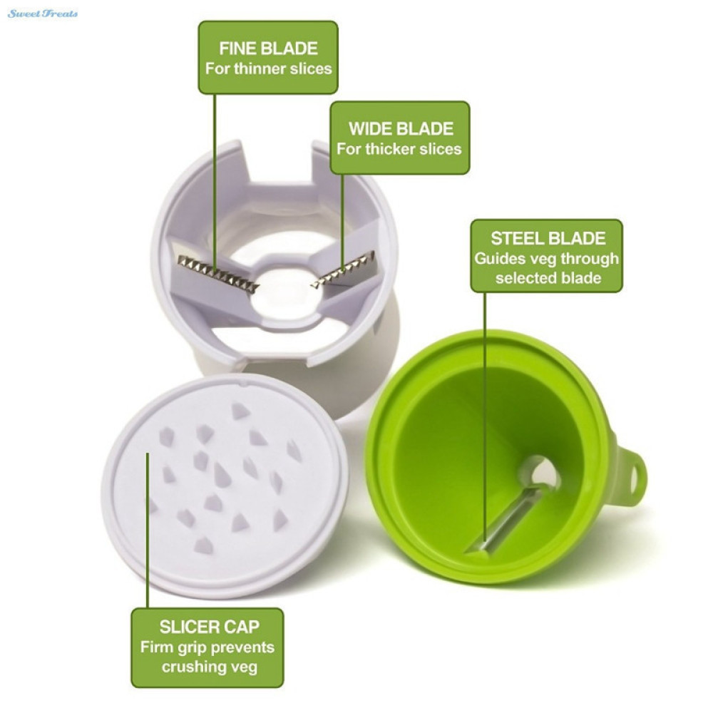 В наборе к овощерезке идут три различных типа ножей из нержавеющей стали, которые позволят вам нарезать как крупные ломтики, так и измельчить овощи и фрукты до необходимых размеров.